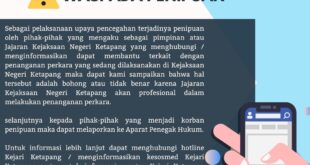Kejaksaan Negeri Ketapang menghimbau kepada seluruh lapisan masyarakat, khususnya masyarakat Kabupaten Ketapang dan Kabupaten Kayong Utara. Agar selalu hati-hati pada setiap informasi yang mengatasnamakan Kepala Kejaksaan Negeri Ketapang, Pegawai Kejaksaan Negeri Ketapang atau Institusi Kejaksaan Negeri Ketapang. Yang meminta transfer sumbangan, biaya perekrutan kerja, atau pun pemerasan sejumlah uang. Jika …