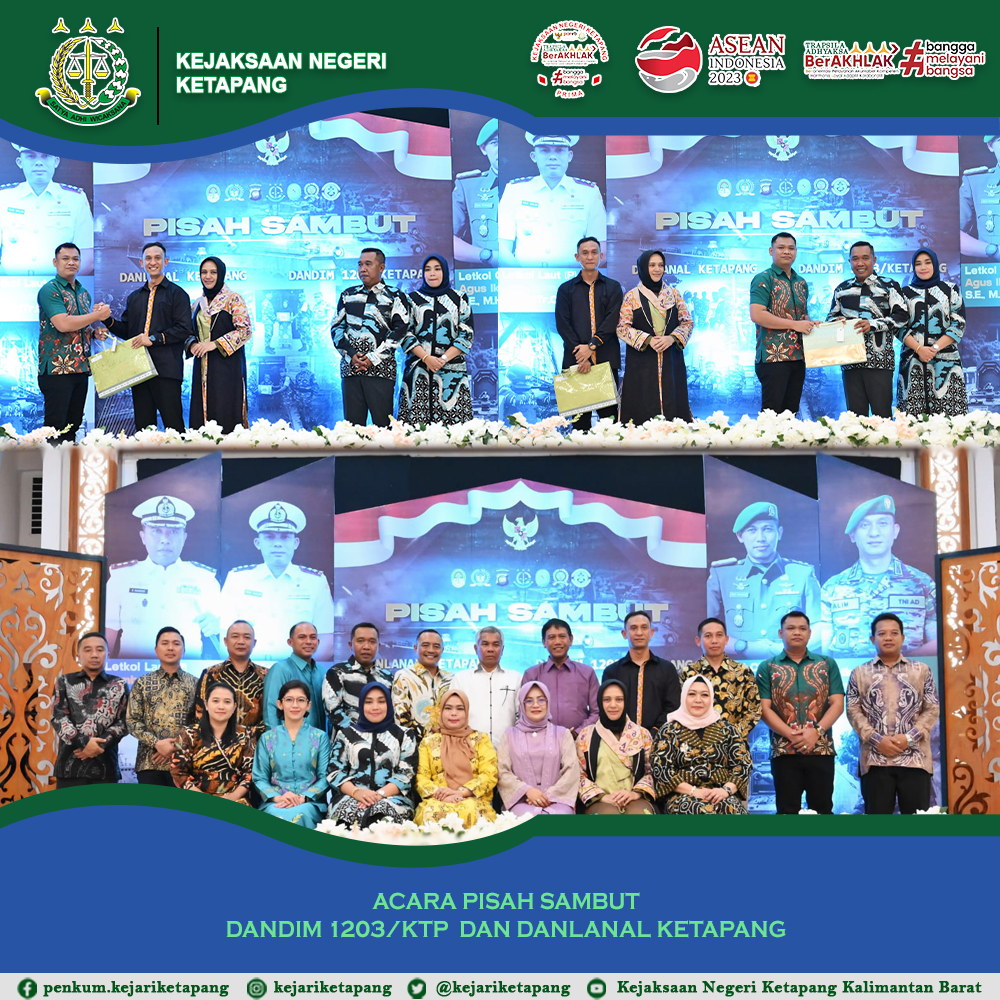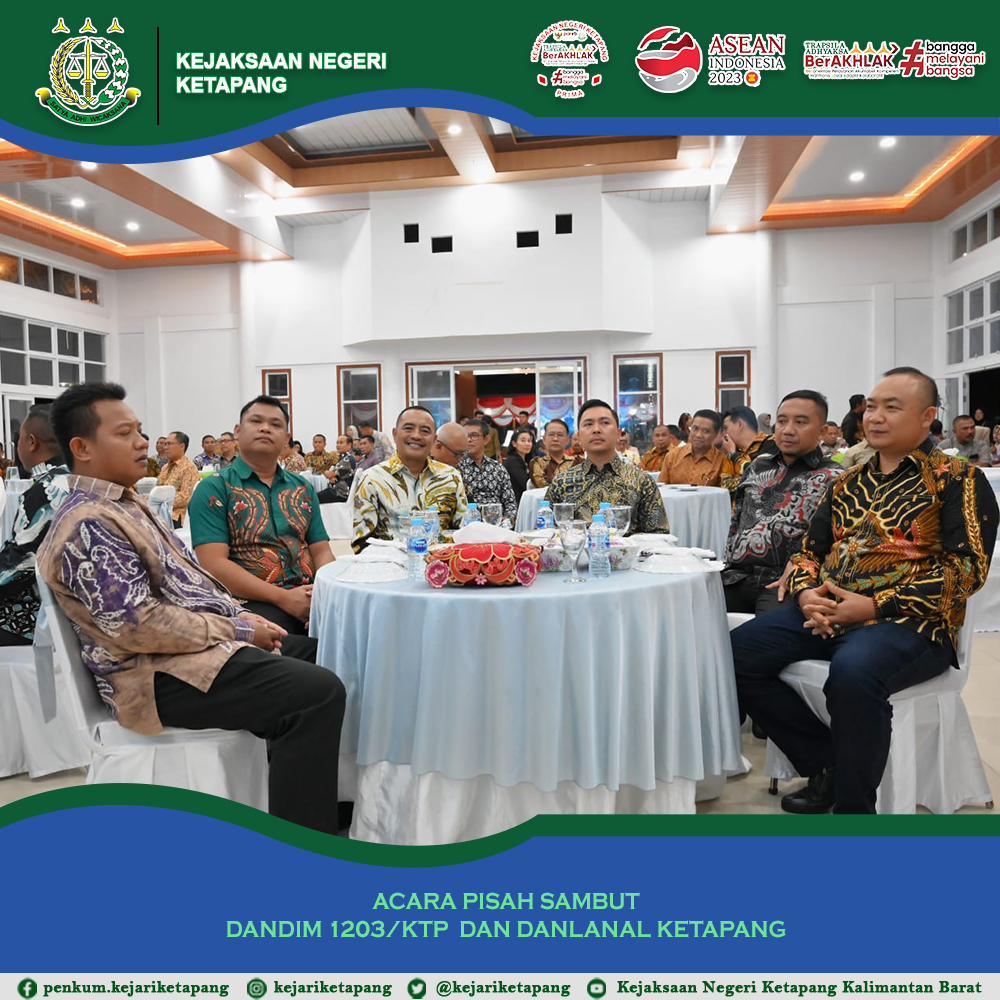 Bertempat di Gedung Pancasila, Jalan Letjend S. Parman, Kecamatan Delta Pawan, Kabupaten Ketapang. Kepala Seksi Intelijen Panter Rivay Sinambela, S.H, dan Kepala Subbagian Pembinaan Doni Marianto, S.H. Menghadiri Acara Ramah Tamah Pisah Sambut Komandan Distrik Militer 1203/Ktp Letkol Inf Alim Musthofa, kepada Letkol CZI Agus Ikwanto,SE., M.HAN, dan Komandan Pangkalan TNI Angkatan Laut Letkol (P) Bambang Nugroho, kepada Letkol Laut (P) Ivan Halim, SH., M.Tr.Opsla.