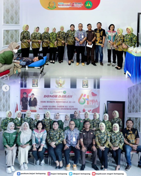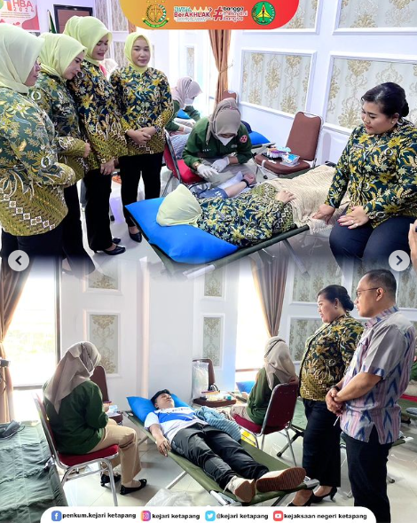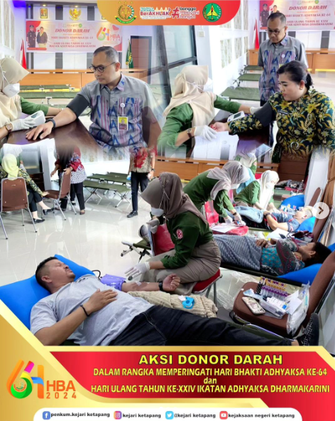 Kepala Kejaksaan Negeri Ketapang Bapak Anthoni Nainggolan, S.H., M.H., Ketua Ikatan Adhyaksa Dharmakarini (IAD) Daerah Ketapang Ny. Letare Anthoni Nainggolan beserta Para Kasi dan Kasubag, Pengurus dan jajaran Anggota Ikatan Adhyaksa Dharmakarini (IAD) Daerah Ketapang serta Pegawai Kejaksaan Negeri Ketapang melaksanakan Kegiatan Donor Darah dalam rangka menyambut Hari Bhakti Adhyaksa ke – 64 tahun dan HUT XXIV Ikatan Adhyaksa Dharmakarini (IAD) Tahun 2024.