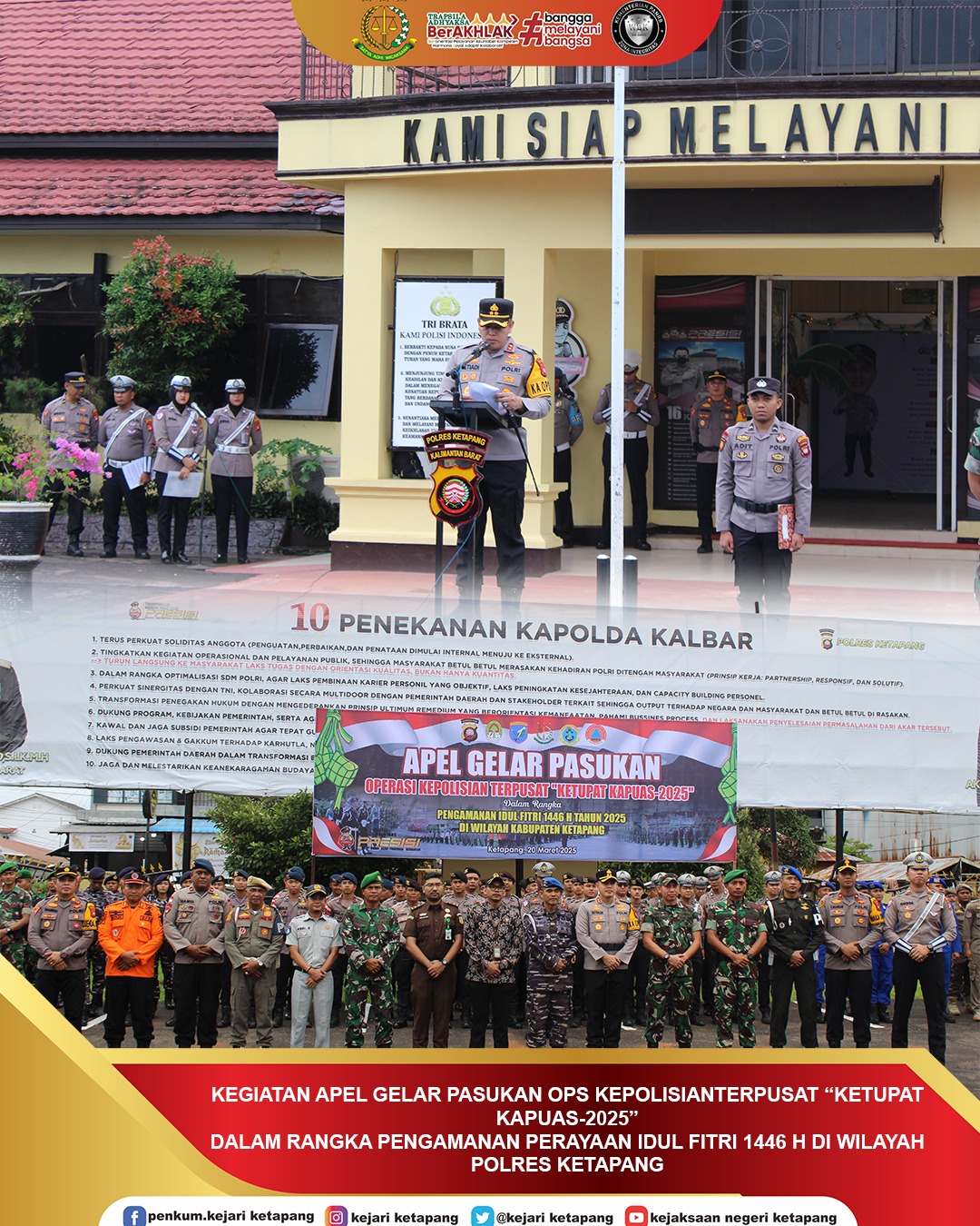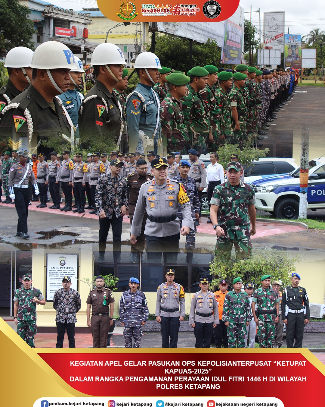 Bertempat di Halaman Polres Ketapang. Kepala Kejaksaan Negeri Ketapang diwakili oleh Jaksa Fungsional Junior Willem John Latumeten, S.H. menghadiri Apel Gelar Pasukan Ops Kepolisian Terpusat “Ketupat Kapuas-2025” dalam rangka Pengamanan Perayaan Idul Fitri 1446 H di wilayah Polres Ketapang.