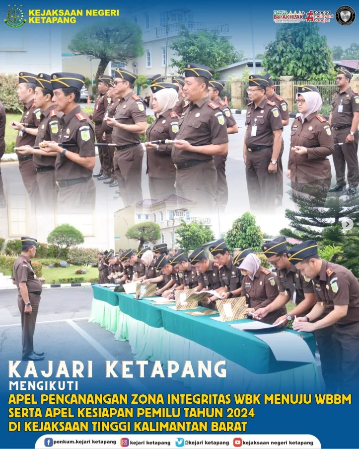 Bertempat di Halaman Kantor Kejaksaan Tinggi Kalimantan Barat, Kepala Kejaksaan Negeri Ketapang RA Dhini Ardhany, SH., MH mengikuti Apel Pencanangan Zona Integritas WBK menuju WBBM tahun 2024 serta Apel Kesiapan Pemilu Tahun 2024 yang dipimpin langsung oleh Kepala Kejaksaan Tinggi Kalimantan Barat Dr. Drs. Muhammad Yusuf, SH., MH.