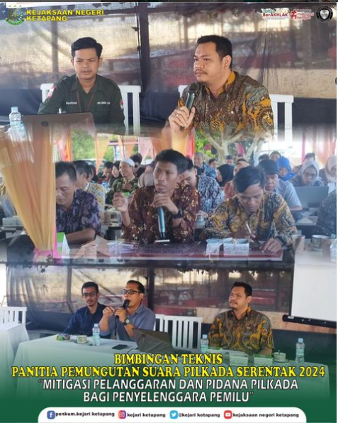 Kepala Kejaksaan Negeri Ketapang diwakili oleh Kepala Seksi Intelijen Panter Rivay Sinambela, S.H, menjadi Narasumber dalam kegiatan pelaksanaan Bimbingan Teknis dan Rapat Koordinasi Anggota Panitia Pemungutan Suara (PPS) untuk Kecamatan Delta Pawan dan Kecamatan Benua Kayong pada Pilkada Serentak Tahun 2024 di lingkungan Komisi Pemilihan Umum Kabupaten Ketapang. Adapun Tema dalam rapat tersebut ” Mitigasi Pelanggaran dan Pidana Pilkada Bagi Penyelenggara Pemilu “.