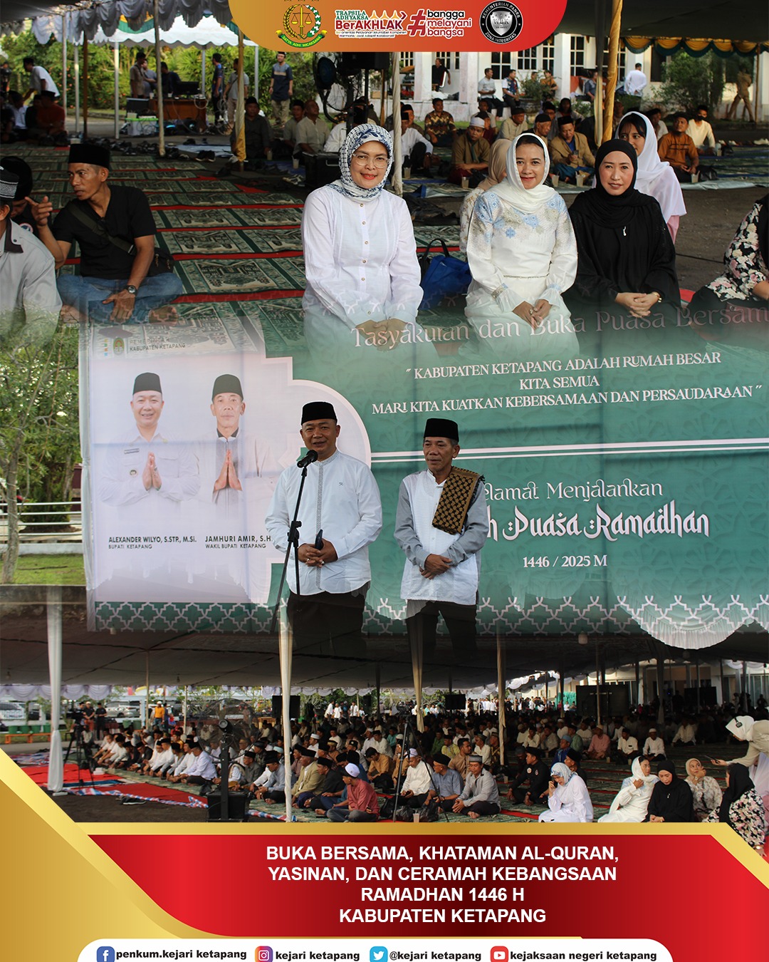 Bertempat di Pendopo Bupati Ketapang, Kepala Kejaksaan Negeri Ketapang diwakili oleh Kepala Seksi Pengelola Barang Bukti dan Barang Rampasan, Wara Endrini, S.T, S.H., M.H. menghadiri Kegiatan Buka Bersama, Khataman AL-QURAN, Yasinan, dan Ceramah Kebangsaan.