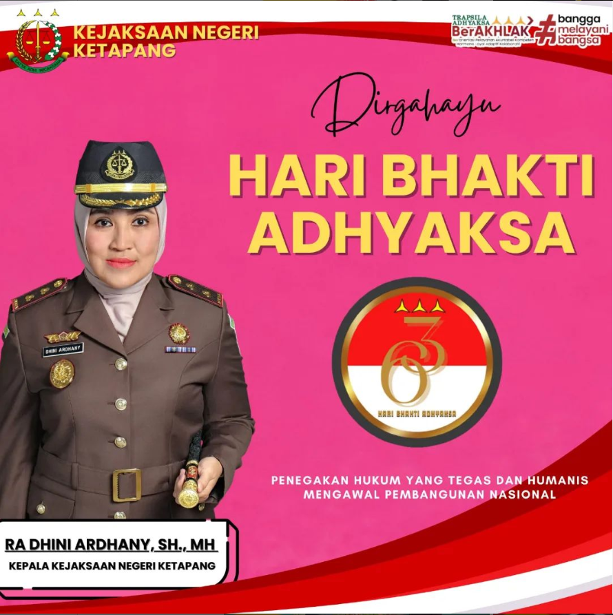Kepala Kejaksaan Negeri Ketapang Ibu RA. Dhini Ardhani, S.H., M.H., beserta Jajaran mengucapkan Dirgahayu Hari Bhakti Adhyaksa Ke-63.
