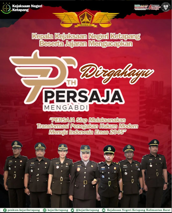 Kepala Kejaksaan Negeri Ketapang RA Dhini Ardhany, S.H., M.H beserta jajaran mengucapkan Dirgahayu Persaja ke – 73 Tahun.