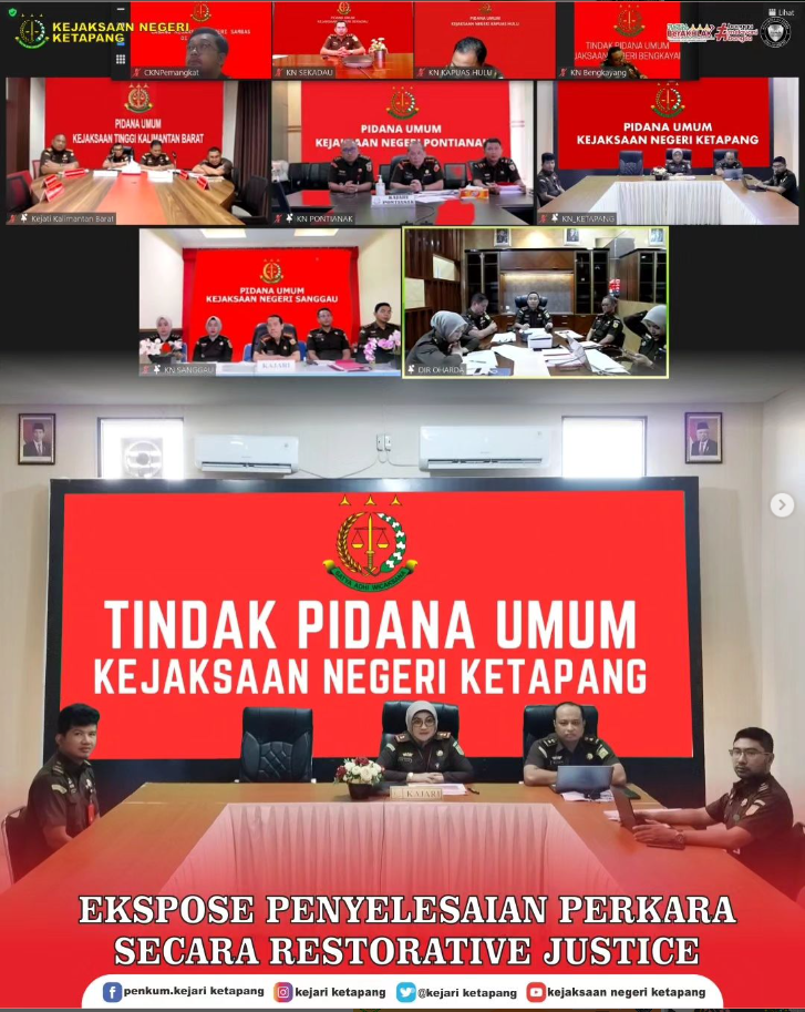 Bertempat di Aula Vicon Kantor Kejaksaan Negeri Ketapang, telah terlaksana kegiatan Ekspose penerapan Restorative Justice oleh Kepala Kejaksaan Negeri Ketapang Ibu RA Dhini Ardhany, S.H.,M.H. Kasi Pidum dan Jaksa fasilitator terhadap 2 (Dua) perkara pidana, Perkara pertama atas nama Tersangka MJ yang Melanggar Pasal 362 KUHPidana, dan Perkara ke Dua Tersangka I MT dan Tersangka II YG yang Melanggar Pasal 351 Ayat 1 KUHP Junto Pasal 55 ayat (1) Ke-1 KUHP atau Pasal 170 Ayat (1) KUHP atau Pasal 335 Ayat (1) Ke-1 KUHP, dihadapan Jaksa Agung Muda Tindak Pidana Umum yang diwakili oleh Direktur OHARDA pada Jaksa Agung Muda Tindak Pidana Umum (Nanang Ibrahim Soleh, S.H., M.H.), Plt. Kepala Kejaksaan Tinggi Kalimantan Barat (Subeno, SH., MM), Asisten Tindak Pidana Umum, dan Para Kepala Kejaksaan Negeri serta Kepala Seksi Tindak Pidana Umum Seluruh Wilayah Kalimantan Barat.