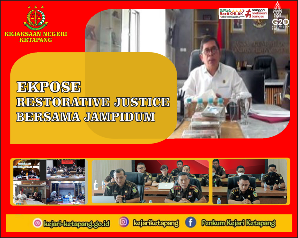 Pada hari Kamis (02/06/022) di aula Kantor Kejaksaan Negeri Ketapang telah dilaksanakan kegiatan ekspose penerapan Restorative Justice terhadap perkara pidana atas nama Terdakwa Ardianto Alias Bagas Alias Kacong Bin Arifin dihadapan Jaksa Agung Muda Tindak Pidana Umum Dr. Fadil Zumhana, SH, MH, Direktur OHARDA pada Jaksa Agung Muda Tindak Pidana Umum, Kepala Kejaksaan Tinggi Kalimantan Barat Dr. Masyhudi, SH, MH., Pelaksana Harian Asisten Tindak Pidana Umum, dan Para Kepala Kejaksaan Negeri dan Kepala Seksi Tindak Pidana Umum Seluruh Wilayah Kalimantan Barat yang dilakukan oleh Kepala Kejaksaan Negeri Ketapang Bapak Alamsyah, S.H.,M.H. Kasi Pidum dan seluruh Jaksa.