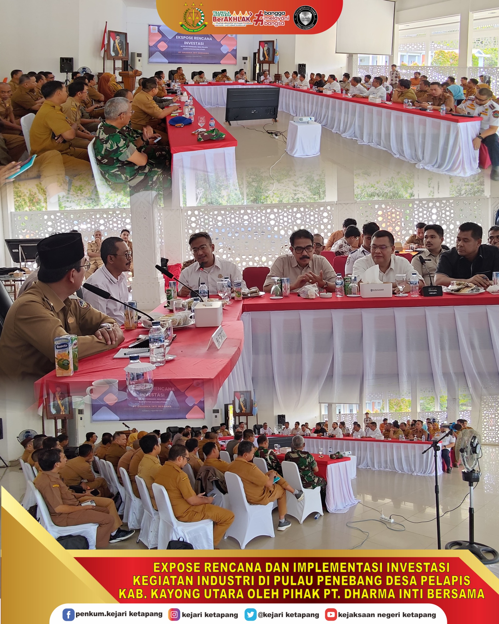 Bertempat di Istana Rakyat (Pendopo Bupati) Kabupaten Kayong Utara, Kepala Kejaksaan Negeri Ketapang diwakili oleh Kepala Seksi Perdata dan Tata Usaha Negara Dhimas Mahendra W, S.H., M.H. menghadiri Undangan Expose Rencana dan Implementasi Investasi Kegiatan Industri Di Pulau Penebang Desa Pelapis Kabupaten Kayong Utara oleh pihak PT. Dharma Inti Bersama.