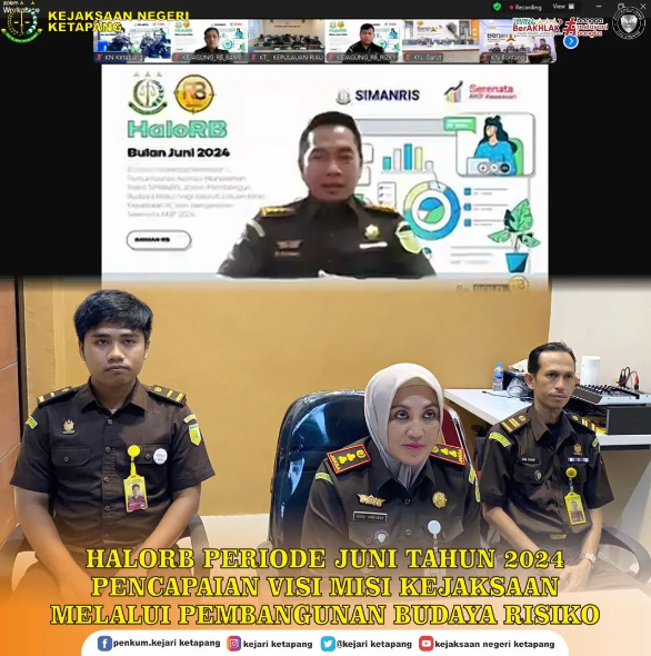 Bertempat di Aula Vicon Kejaksaan Negeri Ketapang, Kepala Kejaksaan Negeri Ketapang Ibu RA. Dhini Ardhany, S.H., M.H beserta Staf Bidang Pembinaan mengikuti Pelaksanaan HaloRB Periode Juni Tahun 2024 melalui aplikasi SIMANRIS, dengan Tema Pencapaian Visi Misi Kejaksaan melalui Pembangunan Budaya Risiko.