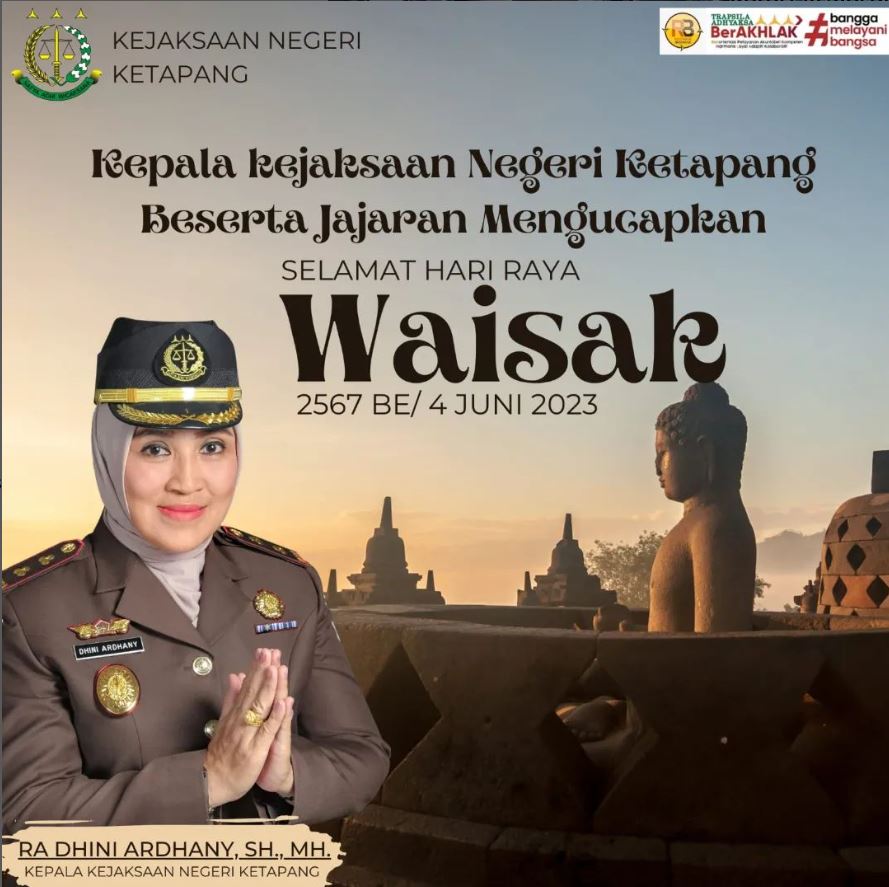 Kepala Kejaksaan Negeri Ketapang Ibu RA. Dhini Ardhani, S.H., M.H., beserta Jajaran mengucapkan Selamat Hari Waisak 2567 BE / 4 Juni Tahun 2023.