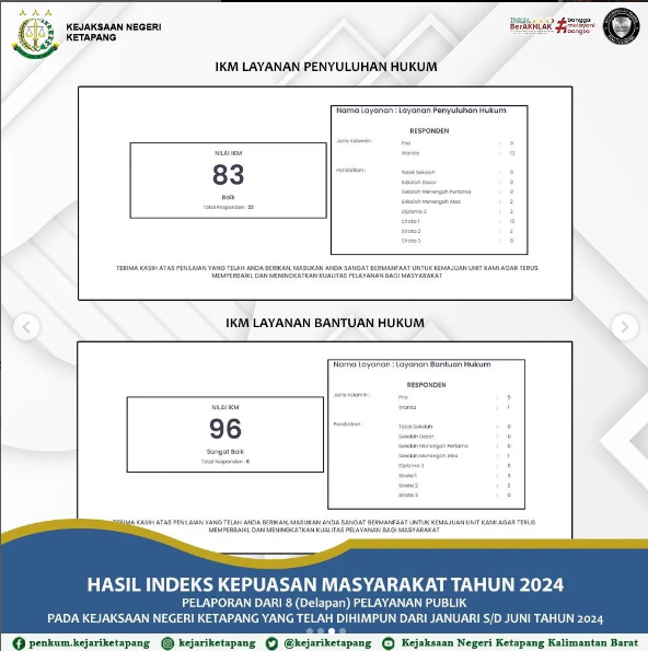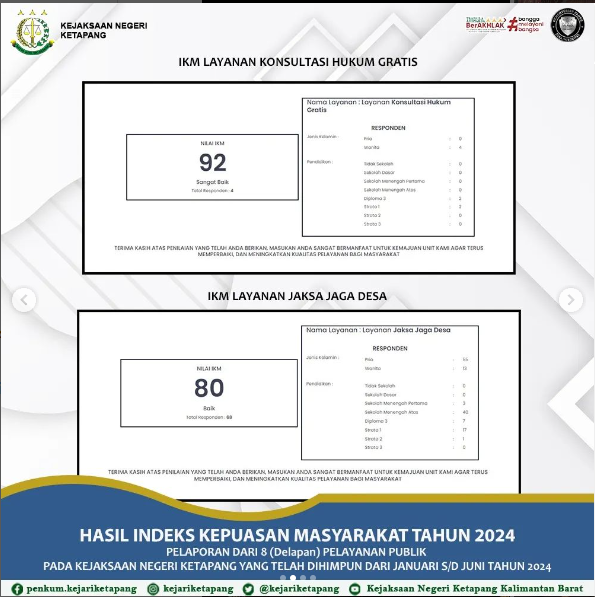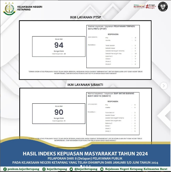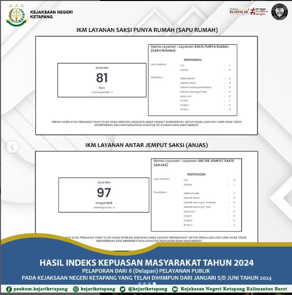 Kami Kejaksaan Negeri Ketapang mengucapkan terima kasih kepada seluruh Responden/ Masyarakat/ Stakeholder yang telah berpartisipasi dalam rangka penghimpunan survei terhadap layanan publik yang kami miliki. Kami berharap dengan adanya survei ini dapat meningkatkan pelayanan kami kedepannya yang lebih PRIMA. Adapun hasil Indeks Kepuasan Masyarakat (IKM) semua layanan tercantum pada postingan berikut.