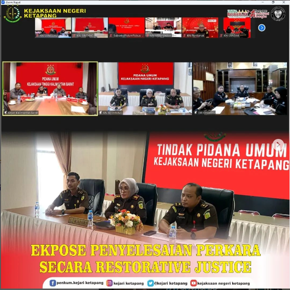 {Kamis, 30 Mei 2024} Bertempat di Aula Vicon Kantor Kejaksaan Negeri Ketapang, telah terlaksana kegiatan Ekspose penerapan Restorative Justice oleh Kepala Kejaksaan Negeri Ketapang Ibu RA Dhini Ardhany, S.H., M.H, Kepala Seksi Tindak Pidana Umum Novan Arianto, S.H dan Jaksa Fungsional Rizky Adi Pratama, S.H, atas nama Tersangka AHH yang Melanggar Pasal 378 KUHPidana jo Pasal 55 ayat (1) ke-1 KUHP, dihadapan Jaksa Agung Muda Tindak Pidana Umum yang diwakili oleh Direktur OHARDA pada Jaksa Agung Muda Tindak Pidana Umum (Nanang Ibrahim Soleh, S.H., M.H.), Plt. Kepala Kejaksaan Tinggi Kalimantan Barat (Subeno, SH., MM), Asisten Tindak Pidana Umum, dan Para Kepala Kejaksaan Negeri serta Kepala Seksi Tindak Pidana Umum Seluruh Wilayah Kalimantan Barat.