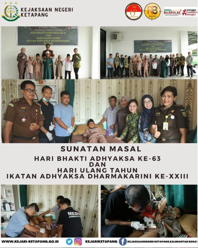 Kejaksaan Negeri Ketapang bekerjasama dengan Ikatan Adhyaksa Dharmakarini (IAD) Daerah Ketapang, melaksanakan Kegiatan Khitanan Masal dalam rangka memperingati HUT Hari Bhakti Adhayksa Ke-63 dan HUT Ikatan Adhayksa Dharmakarini (IAD) Ke-XXIII. Kegiatan tersebut dilaksanakan di ruangan Klinik Kesehatan Kejaksaan Negeri Ketapang yang diikuti oleh 5 (lima) orang anak. Semoga kegiatan khitanan ini membawa keberkahan dan kebahagiaan tersendiri bagi anak-anak yang dikhitan.