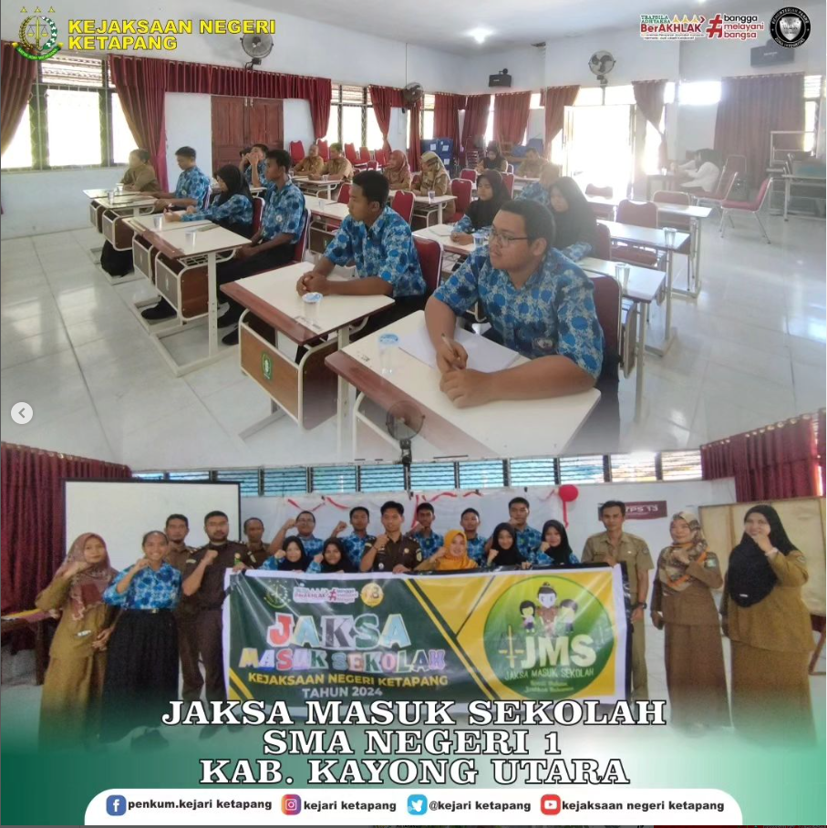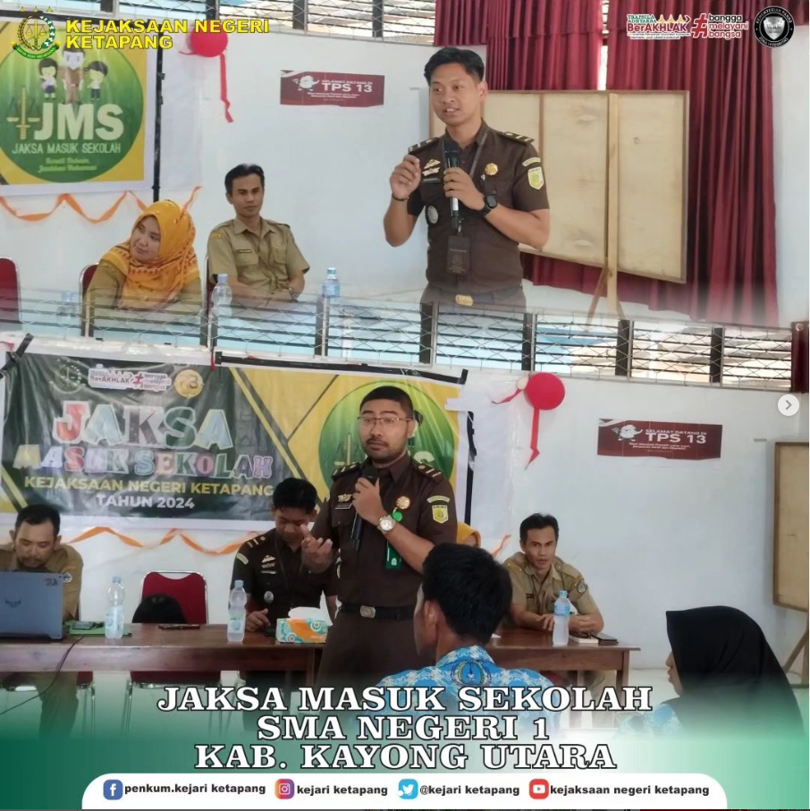 Bertempat di SMAN 01 Sukadana Kabupaten Kayong Utara, Kasubsi Pertimbangan Hukum Nafathony M. Setya Batistuta, SH dan Jaksa Fungsional Junior Willem John Latumeten, SH beserta Staff Intelijen melaksanakan Kegiatan Penyuluhan Hukum Program Jaksa Masuk Sekolah (JMS) dengan materi Penyalahgunaan Narkotika dan cyberbullying adapun tujuan dilaksanakan Kegiatan ini untuk memberikan pemahaman tentang hukum terhadap Siswa dan Siswi sedini mungkin.