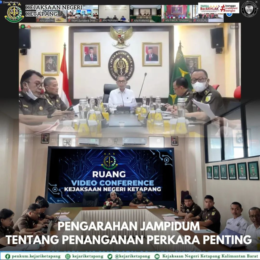 Bertempat di Aula Kantor Kejaksaan Negeri Ketapang, Kepala Kejaksaan Negeri Ketapang, RA Dhini Ardhany, SH.,MH beserta Kepala Seksi seluruh bidang, Kasubbagbin dan Jaksa Fungsional Kejaksaan Negeri Ketapang mengikuti Pengarahan Jampidum tentang Penanganan Perkara Penting melalui Video Conference.