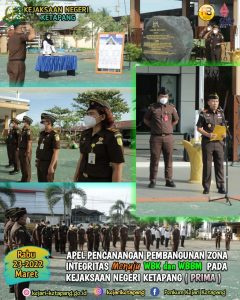 Rabu (23/03/22) Kejaksaan Negeri Ketapang melaksanakan kegiatan apel di Halaman Kantor Kejaksaan Negeri Ketapang, dalam Rangka Pencanangan Pembangunan Zona Integritas menuju Wilayah Bebas dari Korupsi (WBK) dan Wilayah Birokrasi Bersih dan Melayani (WBBM).