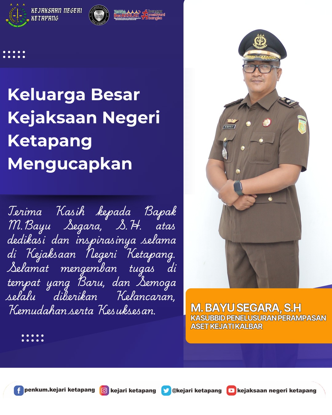 Keluarga Besar Kejaksaan Negeri Ketapang mengucapkan Terimakasih kepada Bapak M.Bayu Segara, S.H. atas dedikasi dan inspirasinya selama di Kejaksaan Negeri Ketapang.
