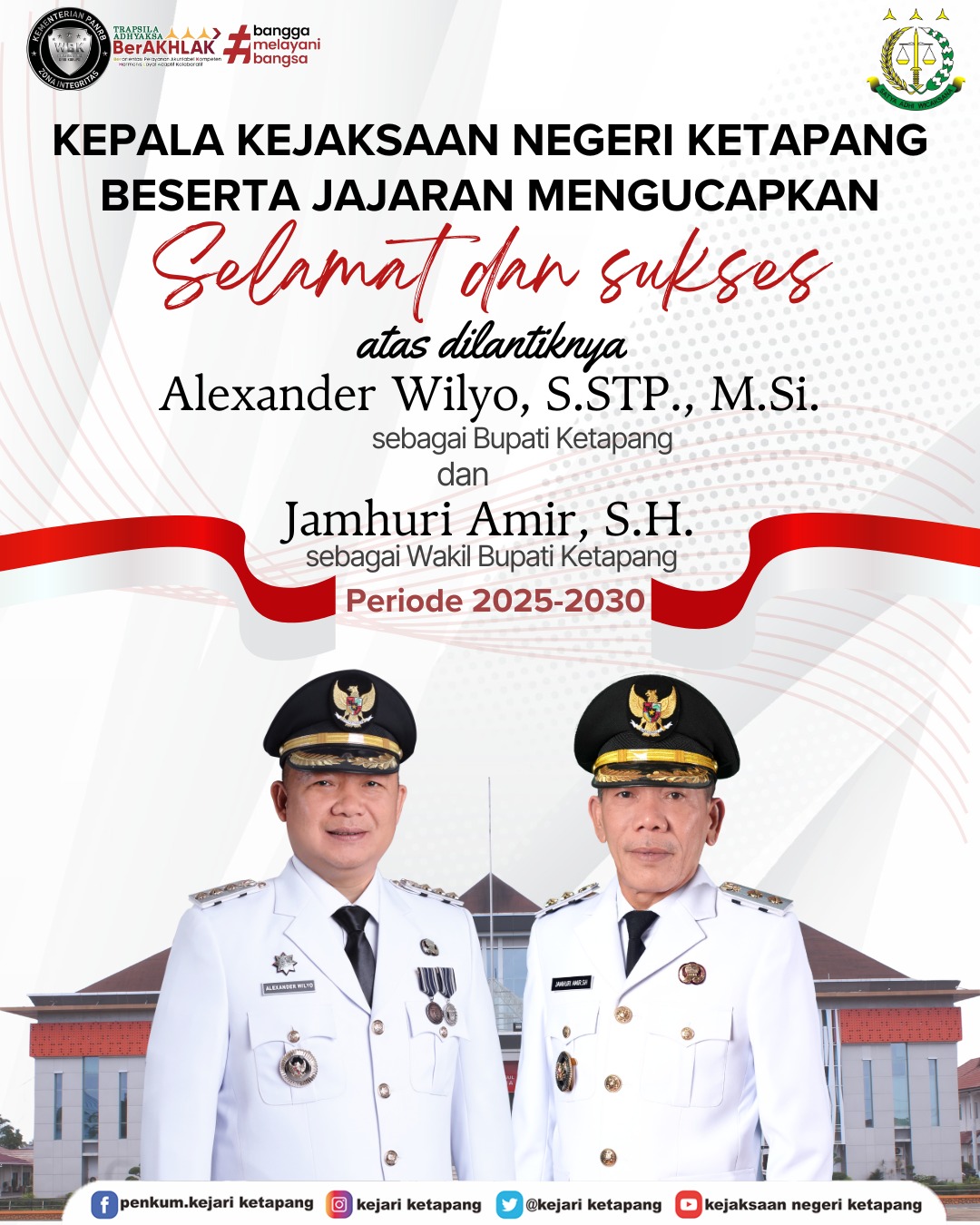 Kepala Kejaksaan Negeri Ketapang Bapak Anthony Nainggolan, S.H.,M.H. Beserta jajaran mengucapkan Selamat dan Sukses atas dilantiknya Bapak Alexander Wilyo, S.STP., M.Si. sebagai Bupati Ketapang dan Bapak Jamhuri Amir, S.H. sebagai Wakil Bupati Ketapang Periode 2025 – 2030.