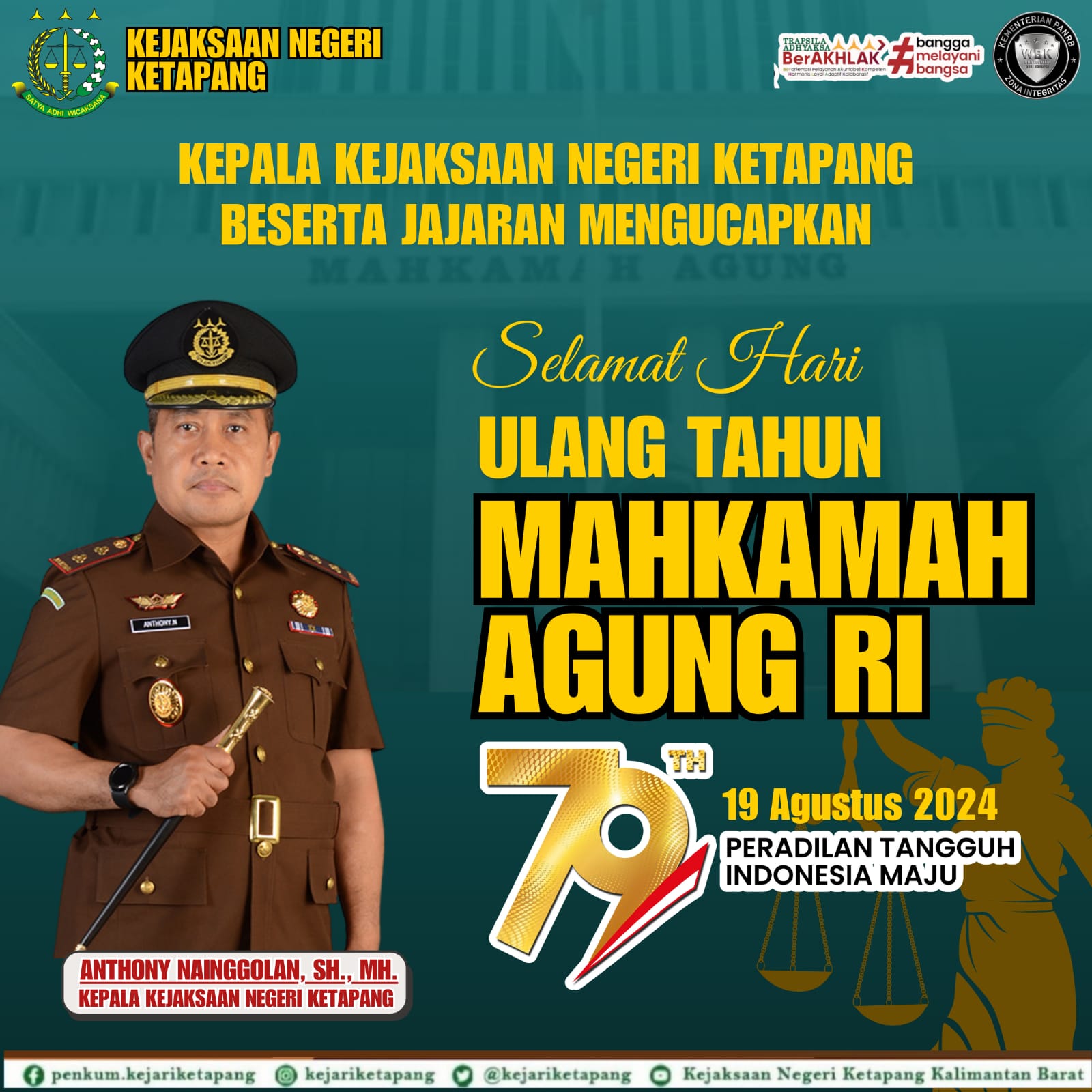 Kepala Kejaksaan Negeri Ketapang Bapak Anthoni Nainggolan, S.H.,M.H., beserta jajaran mengucapkan “Selamat Hari Ulang Tahun Mahkamah Agung Republik Indonesia ke – 79 Tahun”