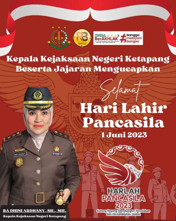 Kepala Kejaksaan Negeri Ketapang Ibu RA. Dhini Ardhany, S.H., M.H., beserta Jajaran mengucapkan Selamat Hari Lahir Pancasila 1 Juni Tahun 2023