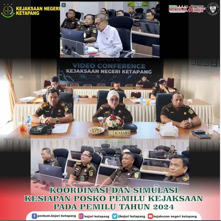 Bertempat di Aula Kejaksaan Negeri Ketapang, Kepala Kejaksaan Negeri Ketapang, Ibu RA Dhini Ardhany, S.H., M.H, Para Kepala Seksi dan Kasubbagbin beserta staf Kejaksaan Negeri Ketapang mengikuti Koordinasi dan Simulasi Kesiapan Posko Pemilu Kejaksaan pada Pemilu Tahun 2024 melalui Video Conference.