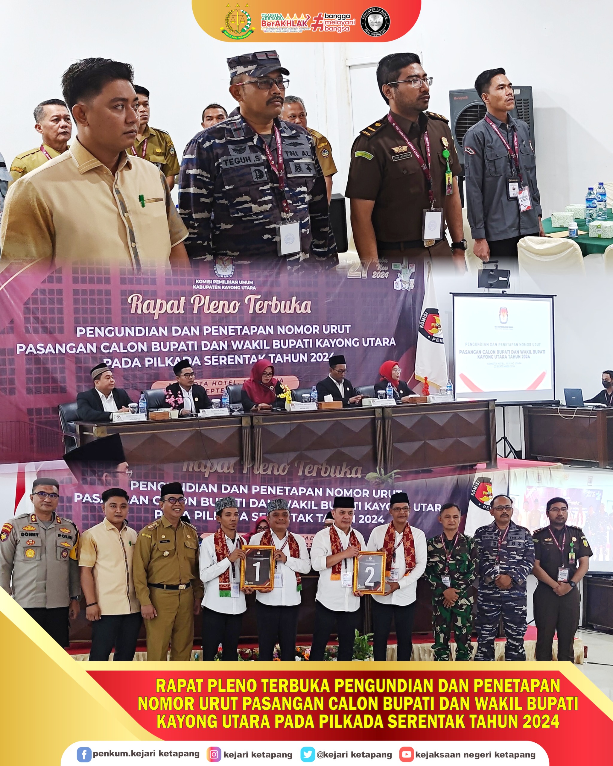 di Ballroom Hotel Mahkota Kayong Utara, Kecamatan Sukadana, Kabupaten Kayong Utara. Kepala Kejaksaan Negeri Ketapang diwakili oleh Jaksa Fungsional Junior Willem John Latumeten, S.H., menghadiri Rapat Pleno Terbuka Pengundian dan Penetapan Nomor Urut Pasangan Calon Bupati dan Wakil Bupati Kayong Utara Pada PILKADA Serentak Tahun 2024.