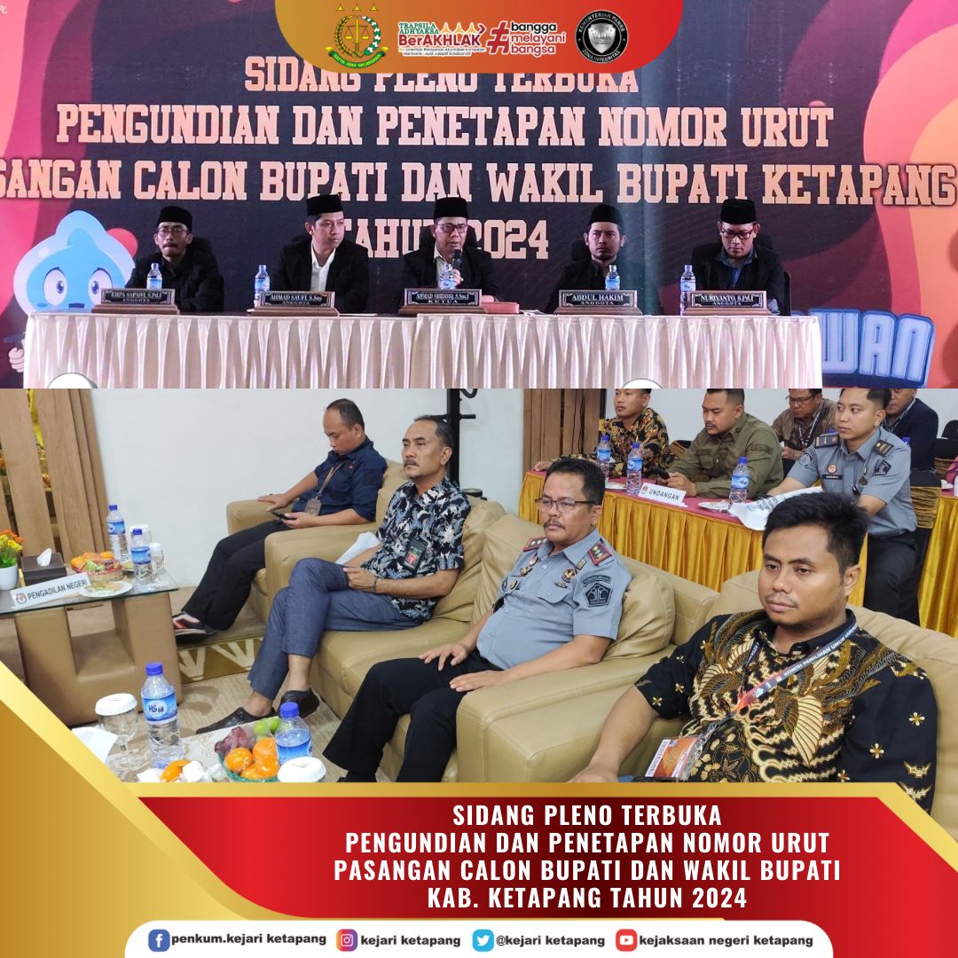 Kepala Kejaksaan Negeri Ketapang diwakili oleh Kepala Sub Seksi Ekonomi, Keuangan, dan Pengamanan Pembangunan Strategis, Arief Wirawan Atmaja, S.H., menghadiri Sidang Pleno Terbuka Pengundian dan Penetapan Nomor Urut Pasangan Calon Bupati dan Wakil Bupati Ketapang Tahun 2024.