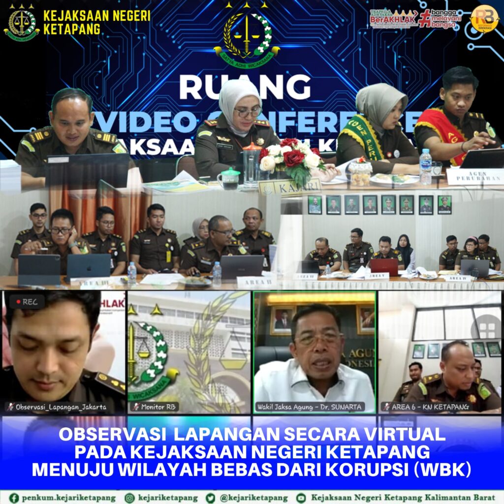 Bertempat di kantor Kejaksaan Negeri Ketapang Ibu RA. Dhini Ardhany, S.H., M.H. Selaku Kepala Kejaksaaan Negeri Ketapang, serta didampingi oleh Para Kasi, Kasubag selaku koordinator 6 area perubahan pembangunan Zona Integritas Kejaksaan Negeri Ketapang tahun 2023, dan 2 Agen Perubahan. Mengikuti penilaian terkait Observasi Lapangan Secara Virtual Pada Kejaksaan Negeri Ketapang Menuju Wilayah Bebas dari Korupsi (WBK) dihadapan Wakil Jaksa Agung Kejaksaan Republik Indonesia Dr. Sunarta, S.H., M.M., beserta Tim penilai internal Bagian Reformasi Birokrasi Kejaksaan Agung RI.