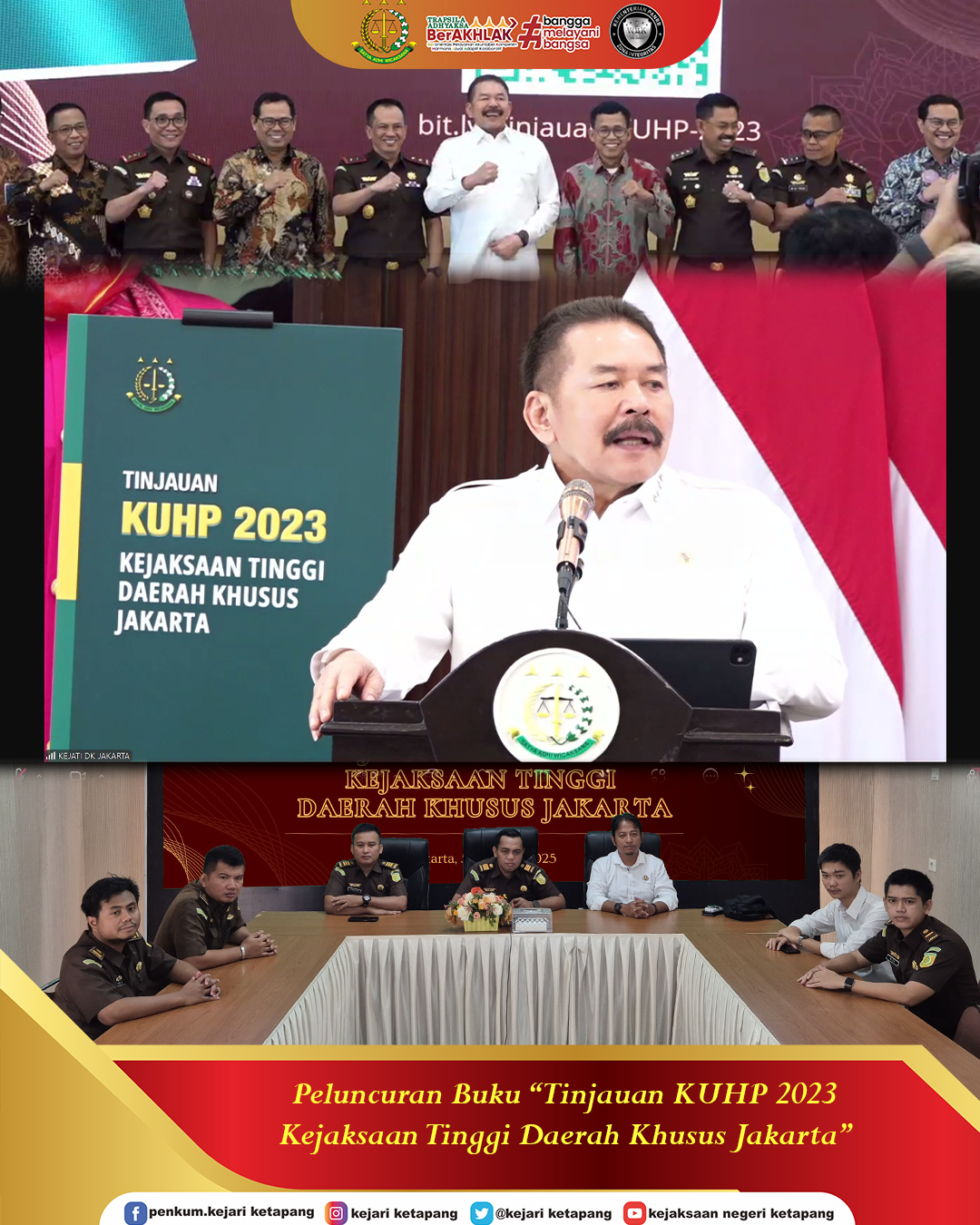 Bertempat bertempat di Aula Kantor Kejaksaan Negeri Ketapang. Kepala Kejaksaan Negeri Ketapang diwakili oleh para Kepala Seksi, Kasubsi dan Jaksa Fungsional mengikuti Peluncuran Buku ” Tinjauan KUHP 2023 Kejaksaan Tinggi Daerah Khusus Jakarta ” memalui video Converence.