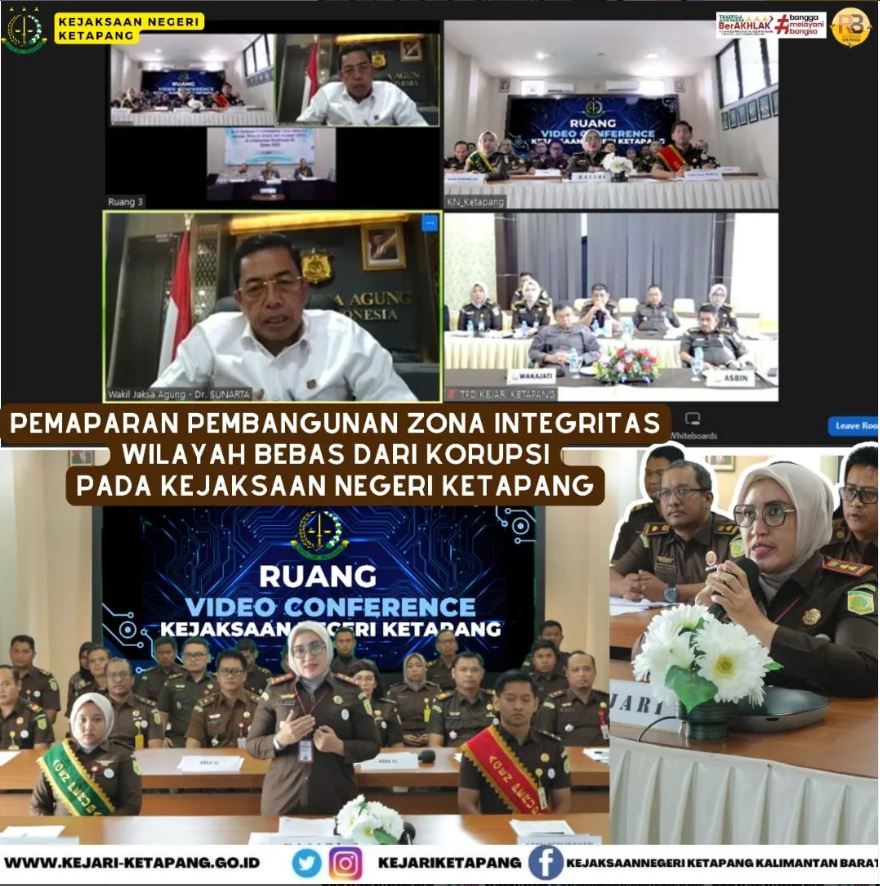 Bertempat di kantor Kejaksaan Negeri Ketapang Ibu RA. Dhini Ardhany, S.H., M.H. Selaku Kepala Kejaksaaan Negeri Ketapang, serta didampingi oleh Para Kasi, Kasubag selaku koordinator 6 area perubahan pembangunan Zona Integritas Kejaksaan Negeri Ketapang tahun 2023, dan 2 Agen Perubahan. Memaparkan secara virtual Pembangunan Zona Integritas Wilayah Bebas Korupsi pada Kejaksaan Negeri Ketapang, dihadapan Wakil Jaksa Agung Kejaksaan Republik Indonesia Dr. Sunarta, S.H., M.M., beserta Tim Penilai Tim penilai internal Bagian Reformasi Birokrasi Kejaksaan Agung RI.