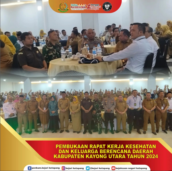 Bertempat di Ballroom Hotel Mahkota Kab. Kayong Utara, Kepala Kejaksaan Negeri Ketapang diwakili oleh Kasubsi Ekonomi, Keuangan, dan Pengamanan Pembangunan Strategis Arif Wirawan Atmaja, S.H., menghadiri Pembukaan Rapat Kerja Kesehatan dan Keluarga Berencana Daerah Kabupaten Kayong Utara Tahun 2024 dengan tema ” Penguatan Tranformasi Kesehatan Melalui Integrasi Lintas Sektor, Swasta Maupun Pemerintah”.