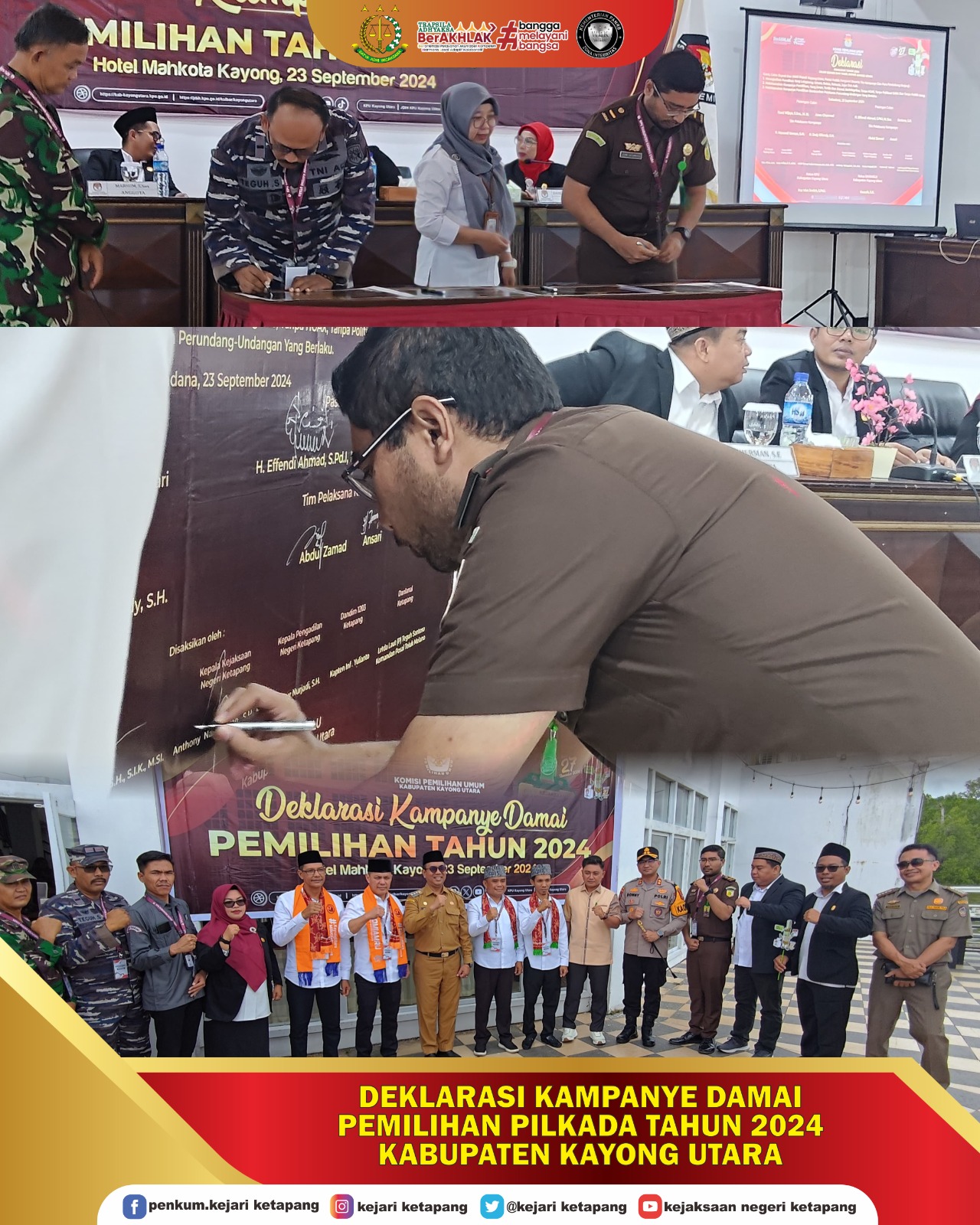 di Ballroom Hotel Mahkota Kayong Utara, Kecamatan Sukadana, Kabupaten Kayong Utara. Kepala Kejaksaan Negeri Ketapang diwakili oleh Jaksa Fungsional Junior Willem John Latumeten, S.H., menghadiri Deklarasi Kampanye Damai Pemilihan PILKADA Tahun 2024 Kabupaten Kayong Utara.