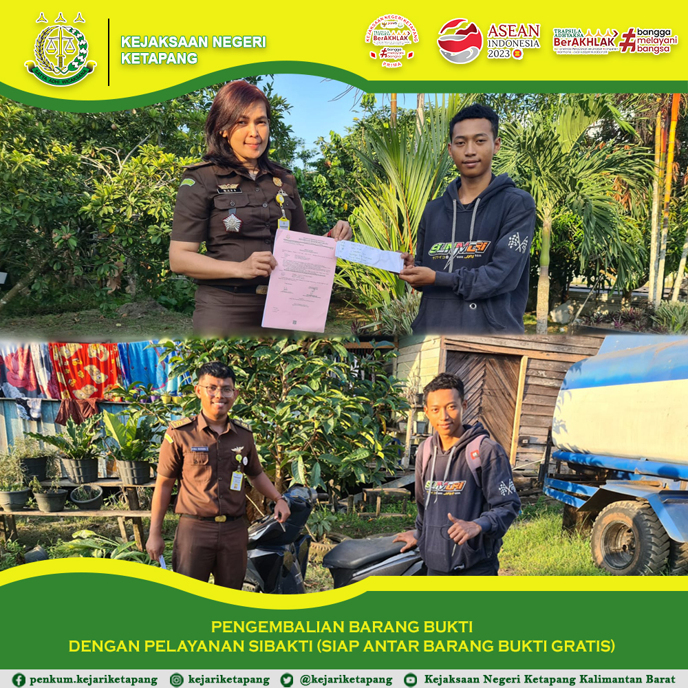 Kejaksaan Negeri Ketapang telah melakukan pengembalian Barang Bukti, berupa Sepeda Motor langsung kepada penerima yang berada di Kecamatan Delta Pawan, Kabupaten Ketapang, secara GRATIS. Program ini merupakan layanan dari Seksi PB3R yang bernama SIBAKTI (Siap Antar Barang Bukti Gratis).