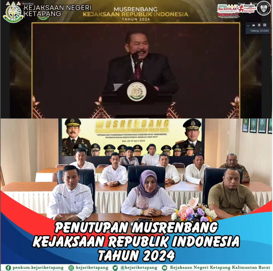 Bertempat di Aula Vicon Kantor Kejaksaan Negeri Ketapang. Kepala Kejaksaan Negeri Ketapang Ibu RA Dhini Ardhany, S.H., M.H. dan Kasi Tindak Pidana Umum Novan Arianto, SH, Kasi Datun Samuel Fernandes Hutahayan, SH., MH Beserta Kasubsi, Jaksa Fungsional, dan Staf Kejaksaan Negeri Ketapang Menghadiri Kegiatan Penutupan Musrenbang Kejaksaan Republik Indonesia Tahun 2024 melalui Video Conference.