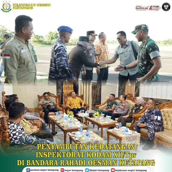Bertempat di Bandara Rahadi Oesman. Kepala Kejaksaan Negeri Ketapang Ibu RA Dhini Ardhany, S.H., M.H., dan beserta Forkopimda Kabupaten Ketapang menghadiri Penyambutan kedatangan Inspektorat Kodam XII/Tanjungpura,