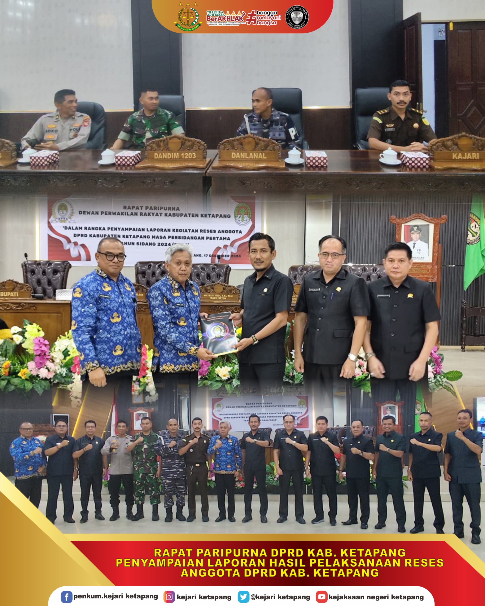 Bertempat di bertempat di Ruang Rapat Paripurna DPRD Kabupaten Ketapang. Kepala Kejaksaan Negeri Ketapang diwakili oleh Kepala Sub Seksi, Ideologi, Politik Pertahanan Keamanan Sosial Budaya Dan Kemasyarakatan, Teknologi Informasi, Produksi Intelijen Dan Penerangan Hukum Rizky Adi Pratama, S.H., menghadiri Penyampaian Laporan Kegiatan Reses Pimpinan dan Anggota DPRD Kabupaten Ketapang Masa Persidangan Pertama Tahun Sidang 2024/2025.