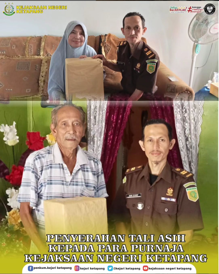 Kepala Kejaksaan Negeri Ketapang diwakili oleh Staf Bidang Pembinaan Bapak Kamsyarif, menyerahkan Tali Asih Kepada Purnaja Kejaksaan Negeri Ketapang Bapak Yusuf Adam yang diwakili Istri dan Bapak Harun Katung.