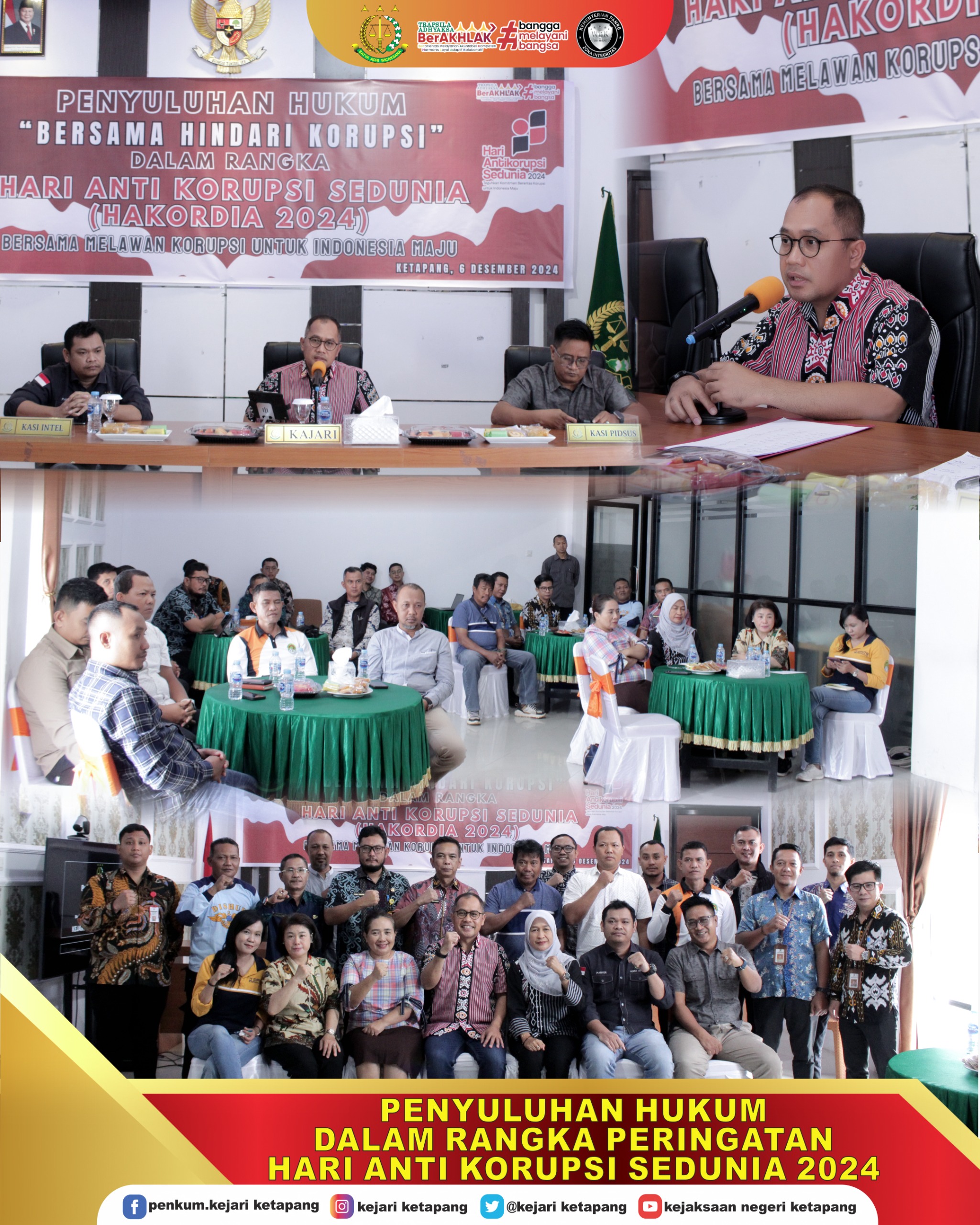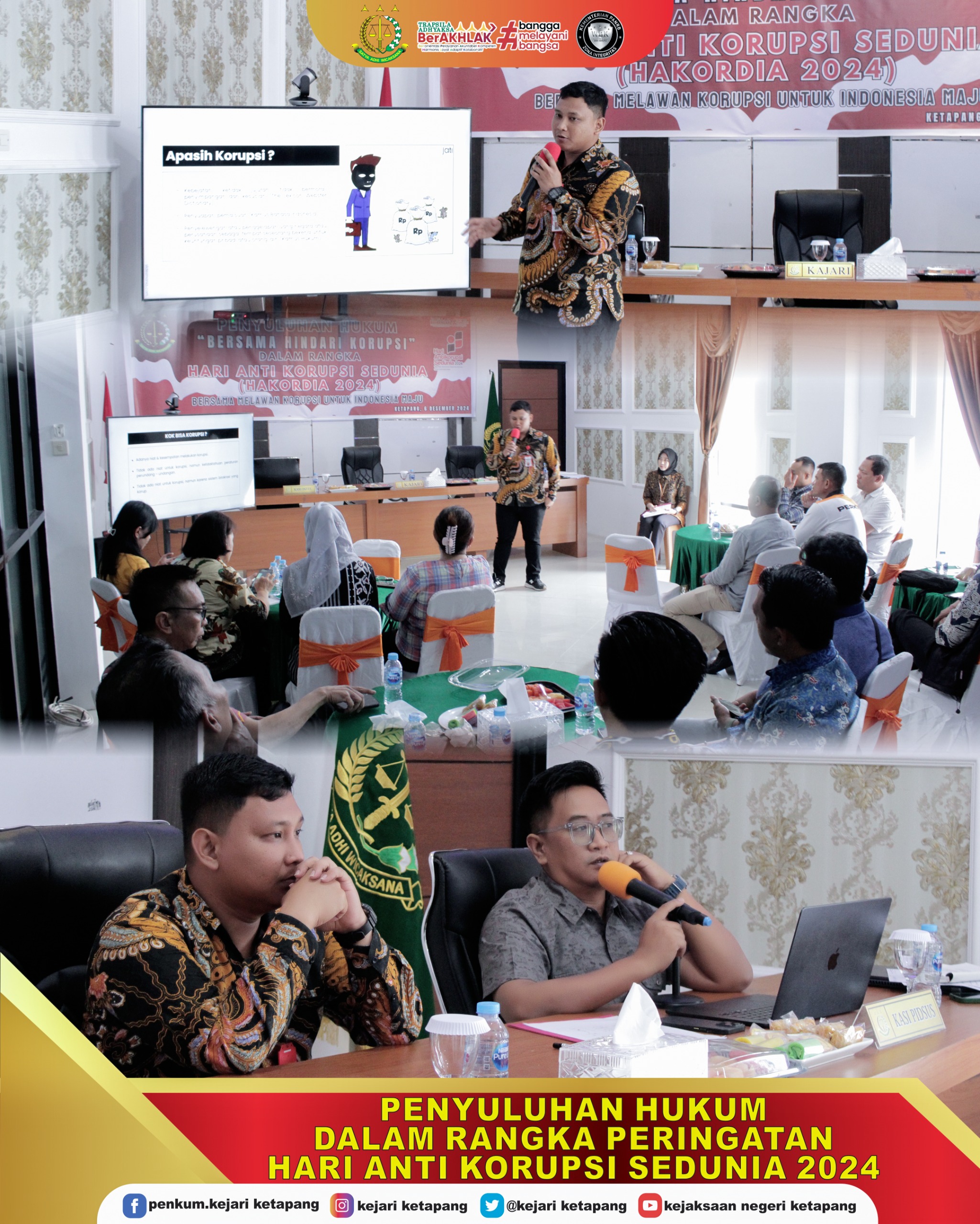 Bertempat di Aula Kantor Kejaksaan Negeri Ketapang. Kepala Kejaksaan Negeri Ketapang Bapak Anthony Nainggolan, S.H., M.H. di damping Kepala Seksi Intelijen Panter Rivay Sinambela, S.H. dan Kepala Seksi Tindak Pidana Khusus M. Bayu Segara, S.H. beserta Staf Tindak Pidana Khusus memberikan Penyuluhan Hukum dalam Rangka Peringatan Hari Anti Korupsi Sedunia (HARKORDIA) tahun 2024 kepada beberapa Instansi Pemerintahan di Kabupaten Ketapang.