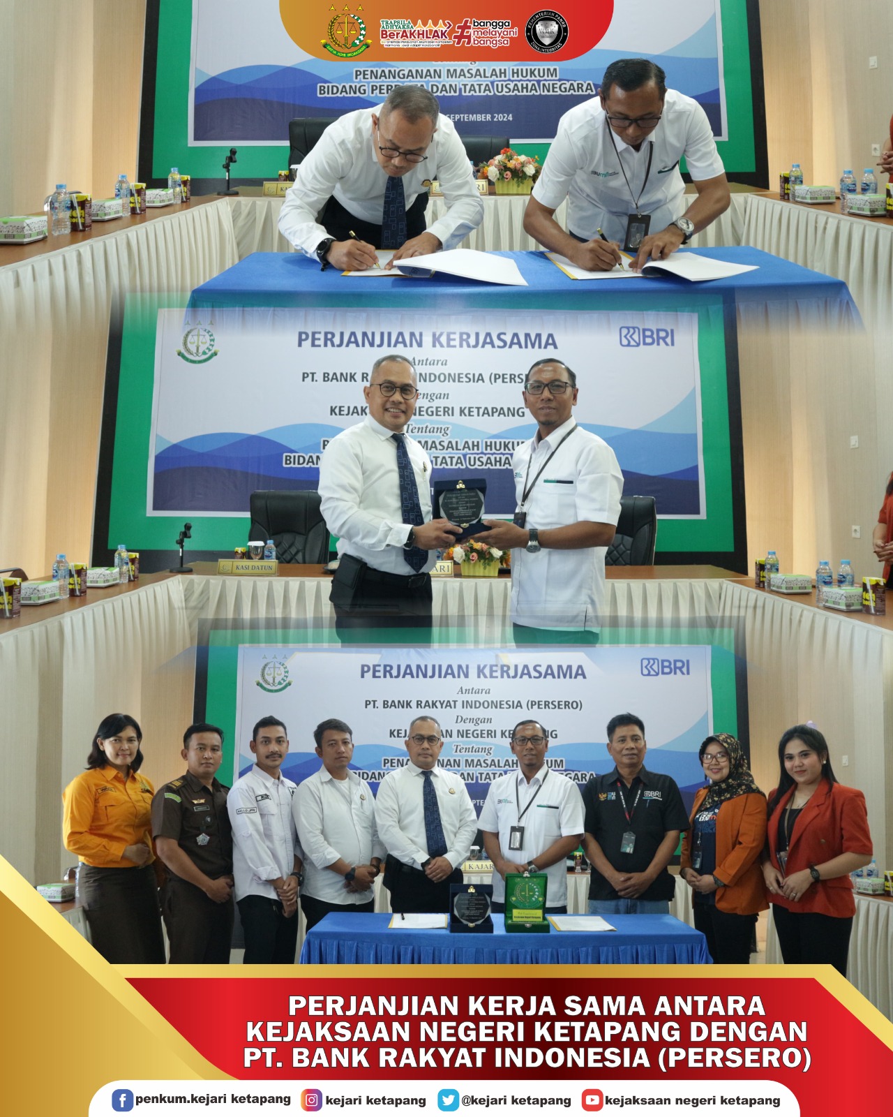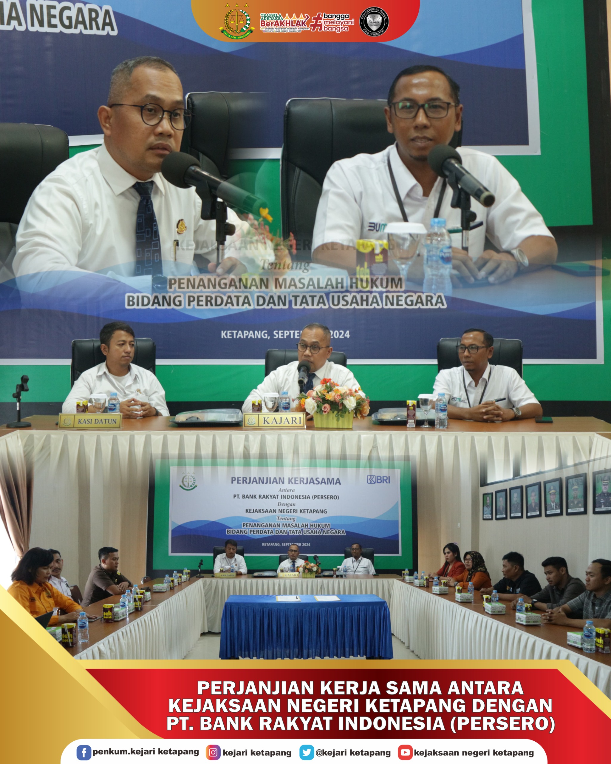 Bertempat di Aula Kantor Kejaksaan Negeri Ketapang, Kepala Kejaksaan Negeri Ketapang Bapak Anthony Nainggolan, S.H., M.H., Kepala Seksi Perdata dan Tata Usaha Negara Dhimas Mahendra W, S.H., M.H., beserta Jaksa Pengacara Negara (JPN) telah melaksanakan Penandatanganan Perjanjian Kerja Sama (MOU) antara Kejaksaan Negeri Ketapang dengan PT. Bank Rakyat Indonesia (Persero) Tbk. Kantor Cabang Ketapang.