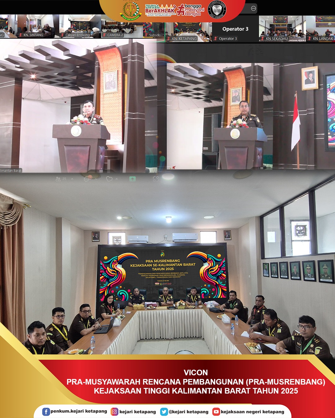 Bertempat di Aula Kejaksaan Negeri Ketapang, Kepala Kejaksaan Negeri Ketapang Bapak Anthony Nainggolan, S.H, M.H, didampingi Para Kasi, Kasubbagbin, Jaksa Fungsional beserta Pegawai Kejaksaan Negeri Ketapang mengikuti Pra-Musyawarah Rencana Pembangunan (PRA-MUSRENBANG) Kejaksaan Tinggi Kalimantan Barat Tahun 2025 melalui Video Conference.