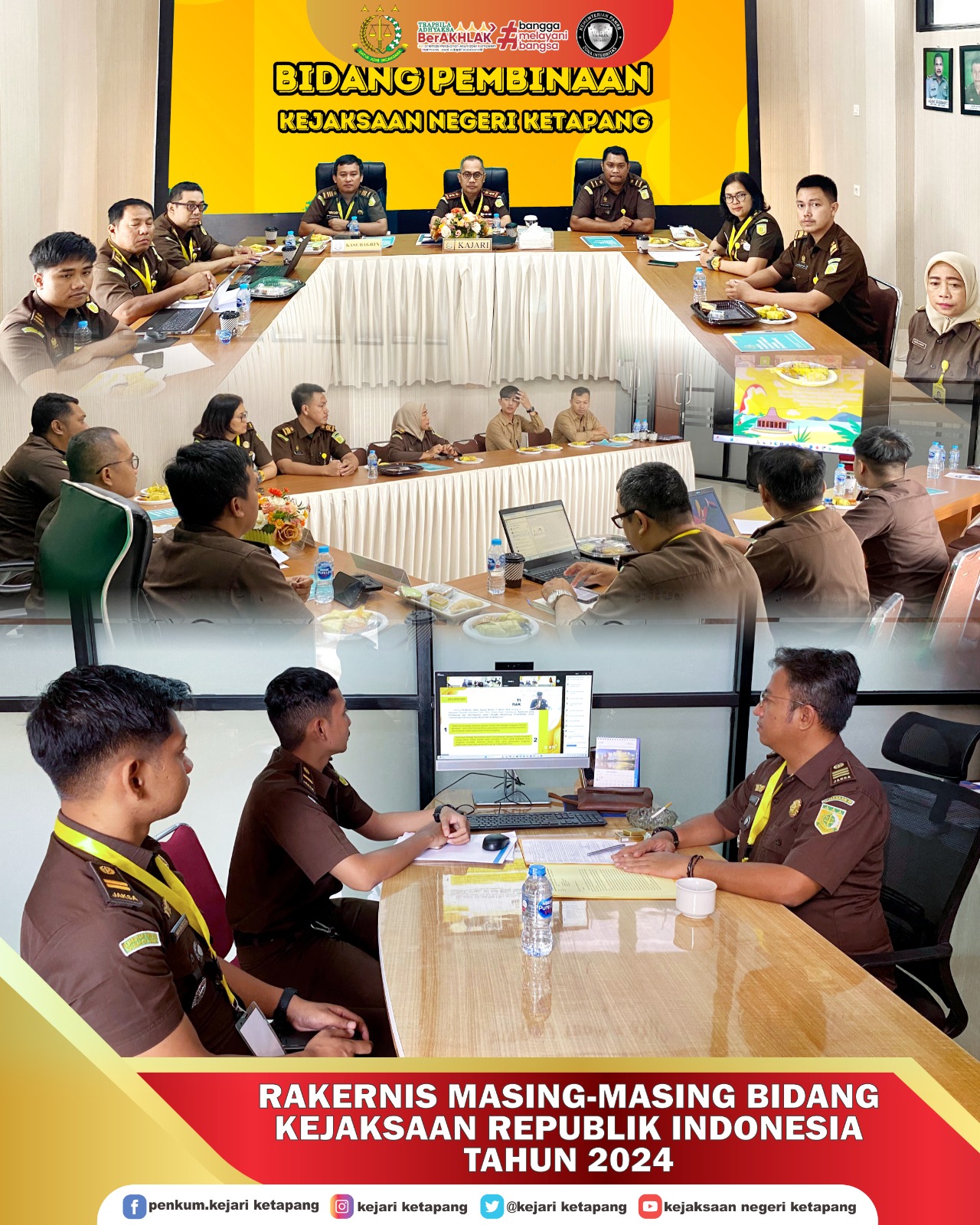 Bertempat di Kejaksaan Negeri Ketapang, Kepala Kejaksaan Negeri Ketapang Bapak Anthoni Nainggolan, S.H., M.H., beserta Para Kasi dan Kasubag, serta Pegawai Kejaksaan Negeri Ketapang melaksanakan kegiatan Rapat Kerja Teknis (RAKERNIS) pada masing-masing Bidang Kejaksaan Republik Indonesia Tahun 2024, melalui Video Conference.