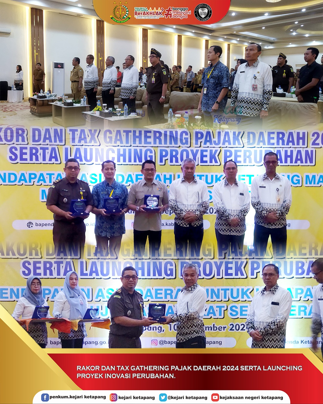 Kepala Kejaksaan Negeri Ketapang diwakili oleh Kaur TU, Kepegawaian, Keuangan dan PNBP, Bapak Efga Rinosya, A.Md., serta Bendahara Pengeluaran, Bapak Pratama Burly, S.H., menghadiri undangan Rakor dan Tax Gathering Pajak Daerah 2024 Serta Launching Proyek Inovasi Perubahan.