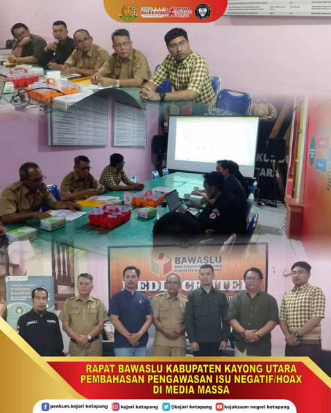 Bertempat di Ruang Rapat Bawaslu Kabupaten Kayong Utara, Kepala Kejaksaan Negeri Ketapang diwakili oleh Jaksa Fungsional Junior Willem John Latumeten, S.H. menghadiri Rapat Bawaslu Kabupaten Kayong Utara Terkait Pembahasan Pengawasan Isu Negatif / Hoax di Media Massa.