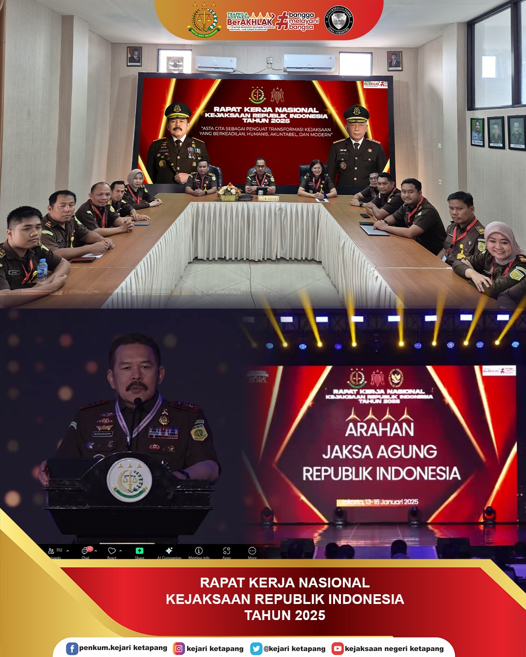 Bertempat di Aula Kejaksaan Negeri Ketapang, Kepala Kejaksaan Negeri Ketapang Bapak Anthony Nainggolan, S.H., M.H. didampingi oleh Seluruh Kasi dan Kasubbag serta diikuti seluruh Pegawai mengikuti Rapat Kerja Nasional Kejaksaan Republik Indonesia Tahun 2025 melalui Video Conference.