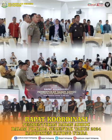 Bertempat di Hotel Mahkota Kabupaten Kayong Utara, Kepala Kejaksaan Negeri Ketapang diwakili oleh Kepala Subseksi Ekonomi Keuangan dan Pengamanan Pembangunan Strategis, Arief Wirawan Atmaja, S.H. menghadiri Undangan Rapat Koordinasi Pembentukan Adhoc dalam Pilkada Serentak Tahun 2024.