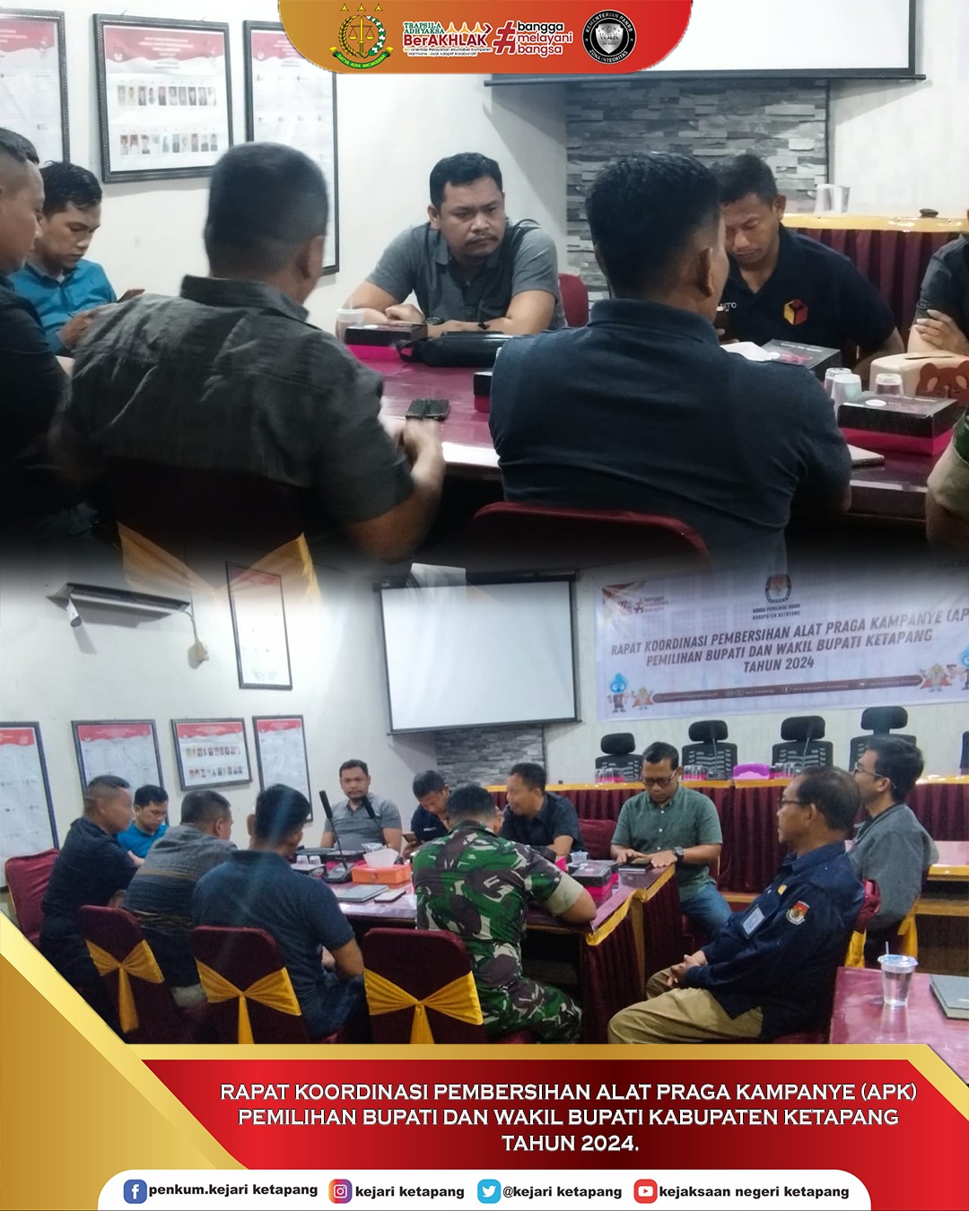 Bertempat di Ruang Rapat Kantor KPU Ketapang, Kepala Kejaksaan Negeri Ketapang diwakili oleh Kepala Seksi Intelijen Panter Rivay Sinambela, S.H. menghadiri Rapat Koordinasi Pembersihan Alat Peraga Kampanye (APK) Pemilihan Bupati dan Wakil Bupati Kabupaten Ketapang Tahun 2024.