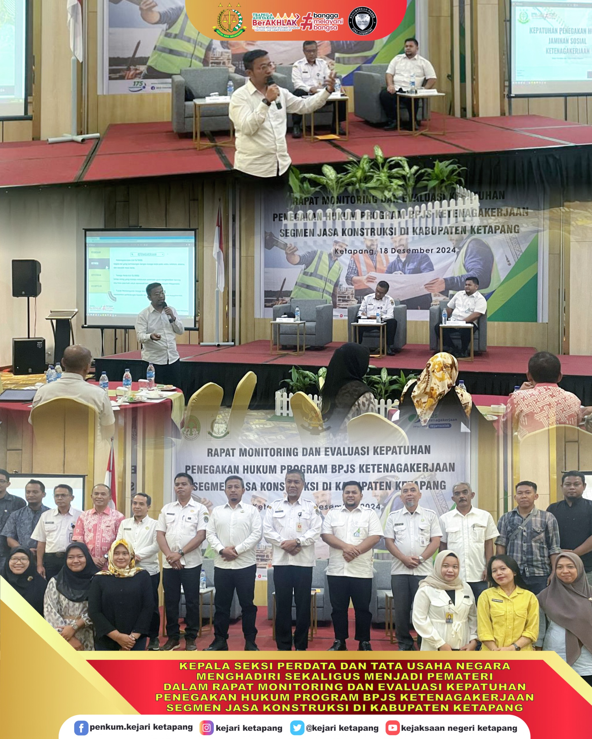 Bertempat di bertempat di Hotel Grand Zuri Ketapang, Kepala Kejaksaan Negeri Ketapang diwakili oleh Kepala Seksi Perdata dan Tata Usaha Negara, Dhimas Mahendra, S.H., M.H. menghadiri sekaligus menjadi pemateri dalam Rapat Monitoring dan Evaluasi Kepatuhan Penegakan Hukum Program BPJS Ketenagakerjaan Segmen Jasa Konstruksi di Kabupaten Ketapang.