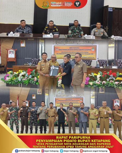 Bertempat di Ruang Rapat Paripurna DPRD Kabupaten Ketapang, Kepala Kejaksaan Negeri Ketapang diwakili oleh Kepala Seksi Intelijen Panter Rivay Sinambela, S.H. menghadiri Rapat Paripurna DPRD Kabupaten Ketapang Dalam Rangka Penyampaian Pidato Bupati Ketapang atas pengantar nota keuangan dan raperda tentang perubahan APBD tahun anggaran 2024.