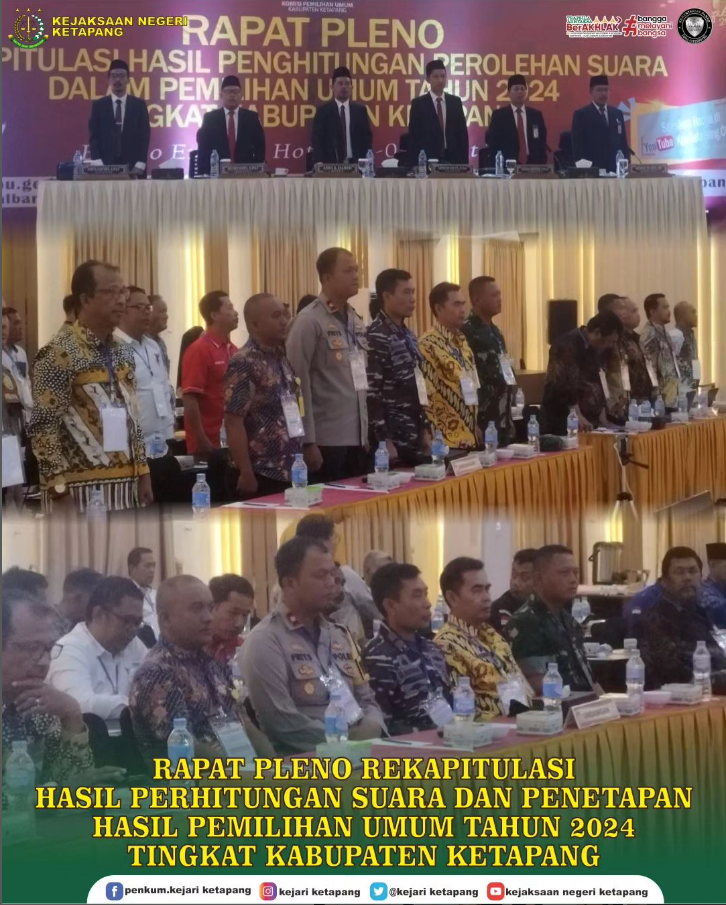 Kepala Kejaksaan Negeri Ketapang RA Dhini Ardhany, SH., MH diwakili oleh Kasi Datun Samuel Fernandes Hutahayan, SH Mengikuti Rapat Pleno Rekapitulasi Hasil Perhitungan Suara dan Penetapan Hasil Pemilihan Umum Tahun 2024 Tingkat Kabupaten Ketapang.