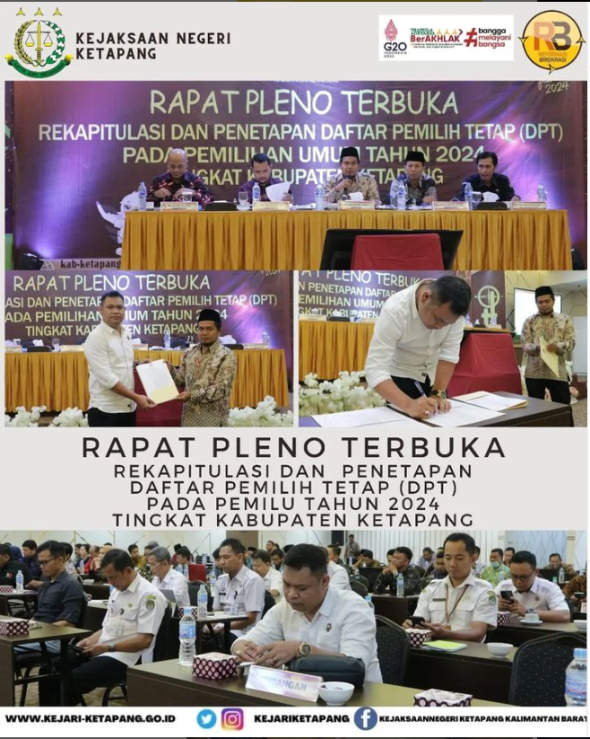Bertempat di Hotel Borneo Emerald Jalan Dr. Sutomo No. 68, Kelurahan Mulia Baru, Kecamatan Delta Pawan, Kabupaten Ketapang, Kalimantan Barat. Kepala Seksi Intelijen Kejaksaan Negeri Ketapang Panter Rivay Sinambela, S.H., menghadiri Rapat Pleno Terbuka Rekapitulasi dan Penetapan Daftar Pemilih Tetap (DPT) KPU Kabupaten Ketapang Pada Pemilu Tahun 2024.